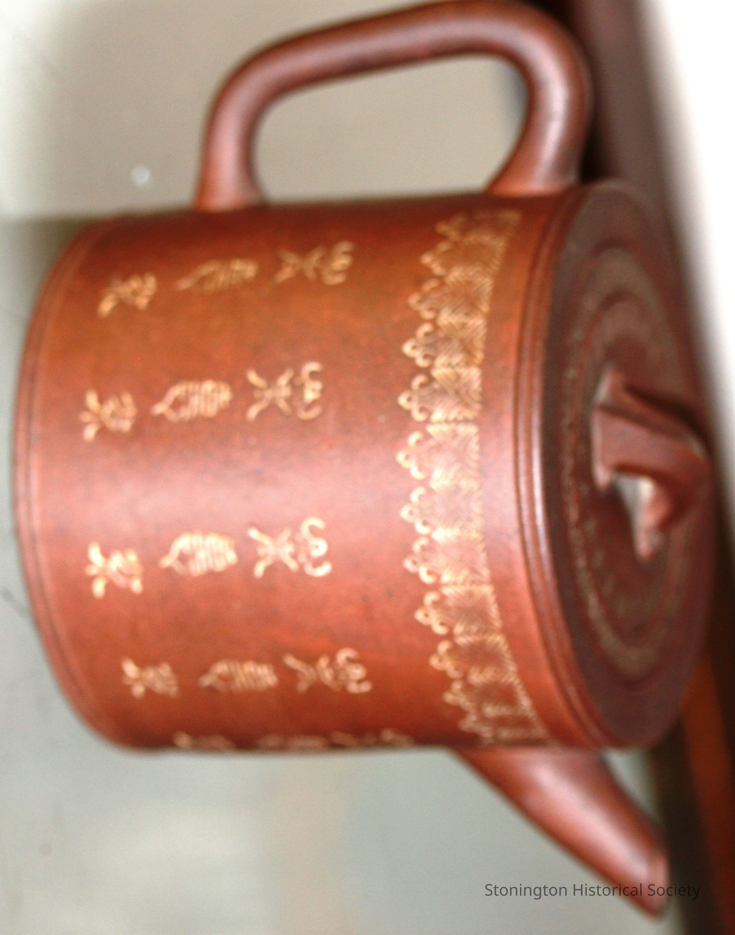 Chinese earthenware teapot with Chinese characters, unglazed. Brownish-red in color. Removable integral strainer. Yixing ware. Early 19th century. For brewing leaf tea – not the ground tea of the famous tea bowls, etc.