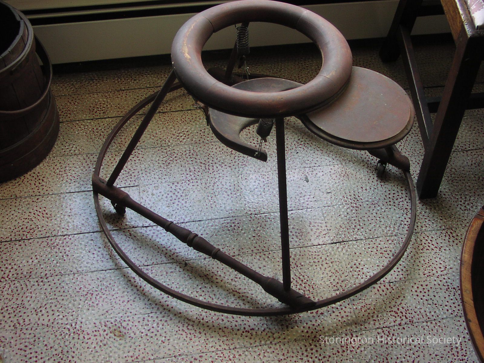 Circular wood "walker" for toddler with small wheels and tray; woodwn seat suspended from springs. Original red paint. C. 1890.Collection