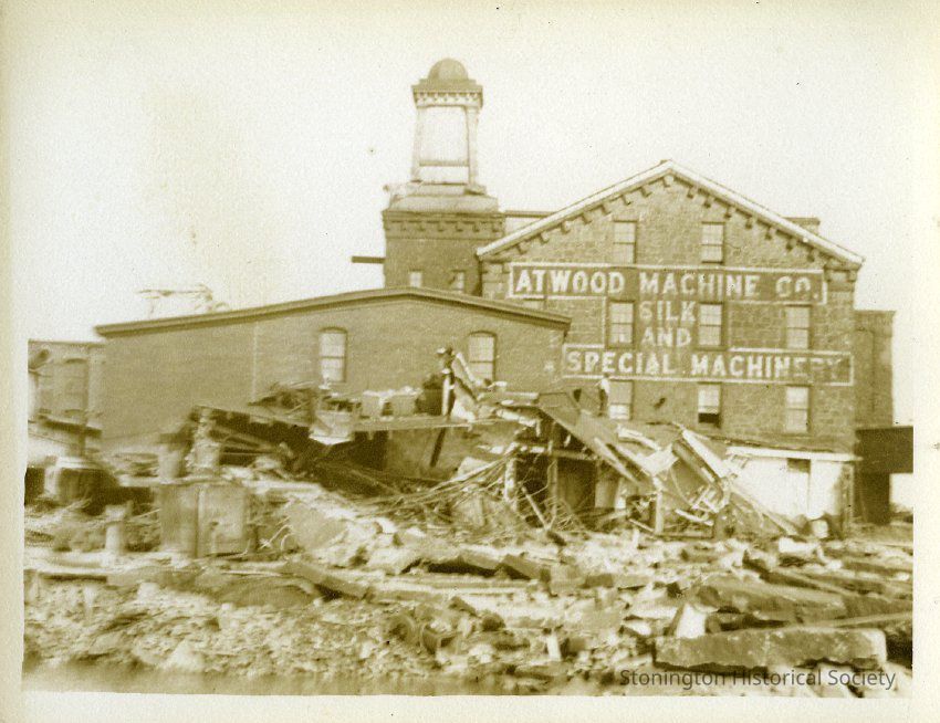 Back (harborside) of Atwood Machine Co. showing destruction Shows full name Atwood Machine Co. Silk and Special Machinery