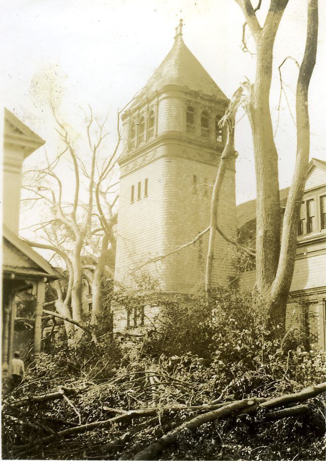 Baptist Church on corner of Union and Main Streets with downed trees