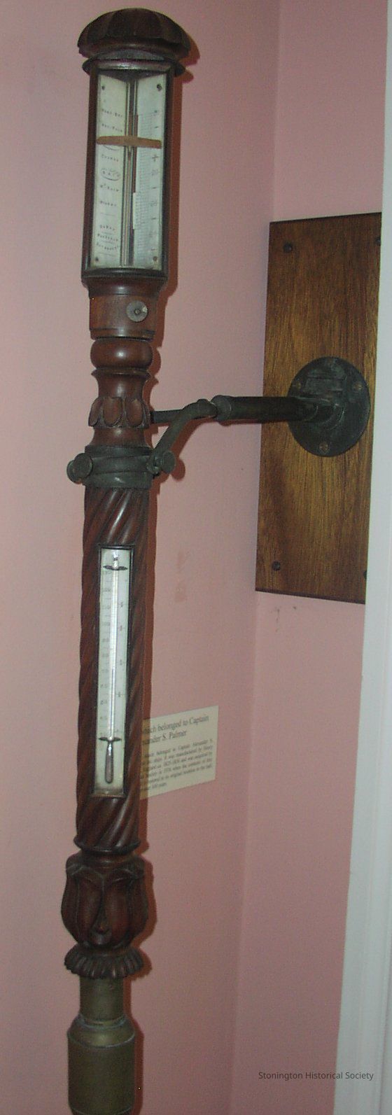 Barometer/thermometer originally belonging to Capt. A.S. Palmer and said to have been installed on every ship he was captain of. Carved rosewood or mahogany(?) with turned, swirled themometer case, brass container at stem for mercury; mounted on 12" long gimble mount. Placed in front hall after Alexander retired from the sea. Purchased by SHS in 1976 at auction.