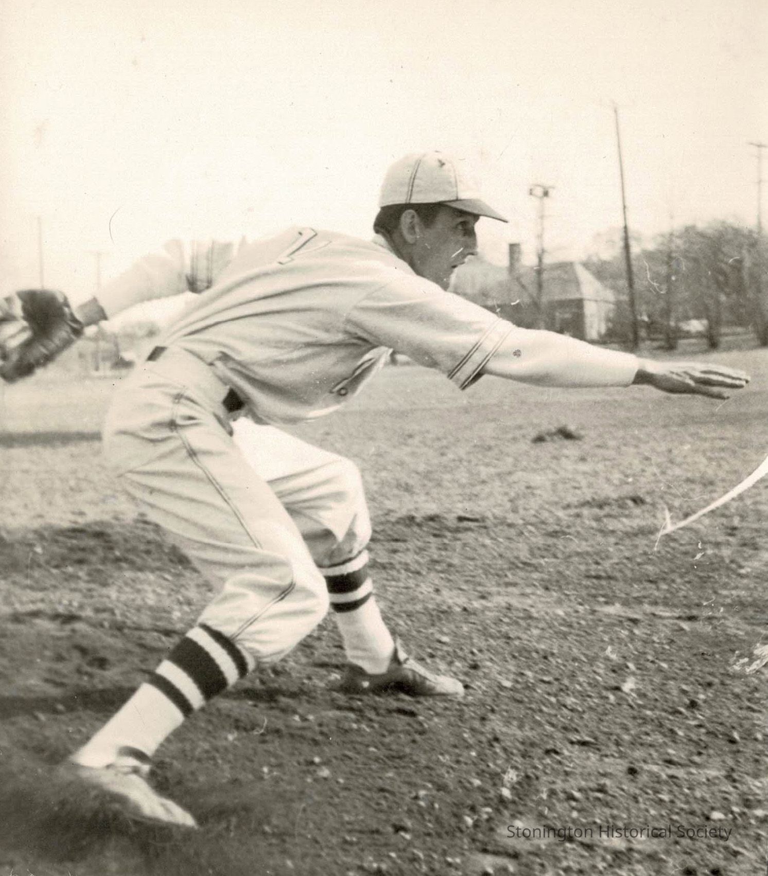 Man in baseball uniform, in action, at unknown location. Building in the background could be the Stonington COMO, but it is unclear. Photograph is undated, but most likely in the 1930s or 1940s.Collection