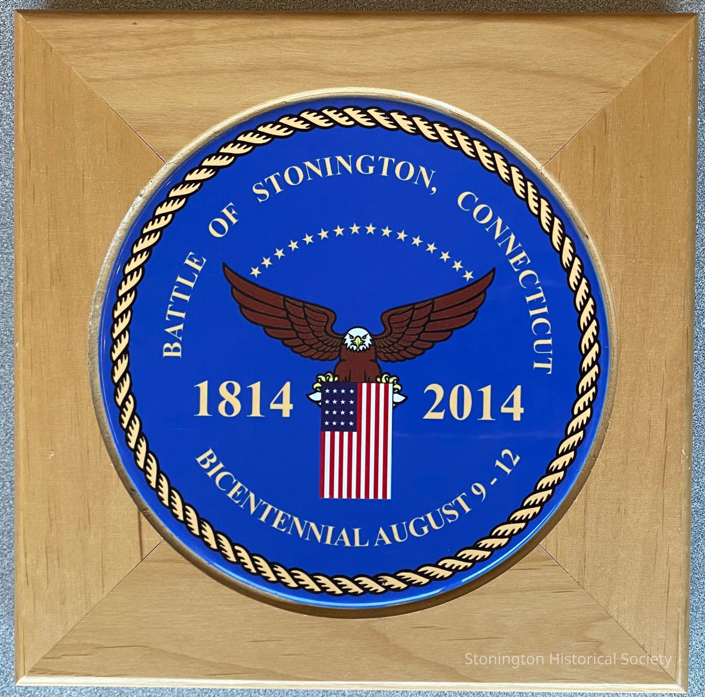 Battle of Stonington Bicentennial seal, mounted on wood, 7.75" x 7.75" Designed by Tod Johnstone.