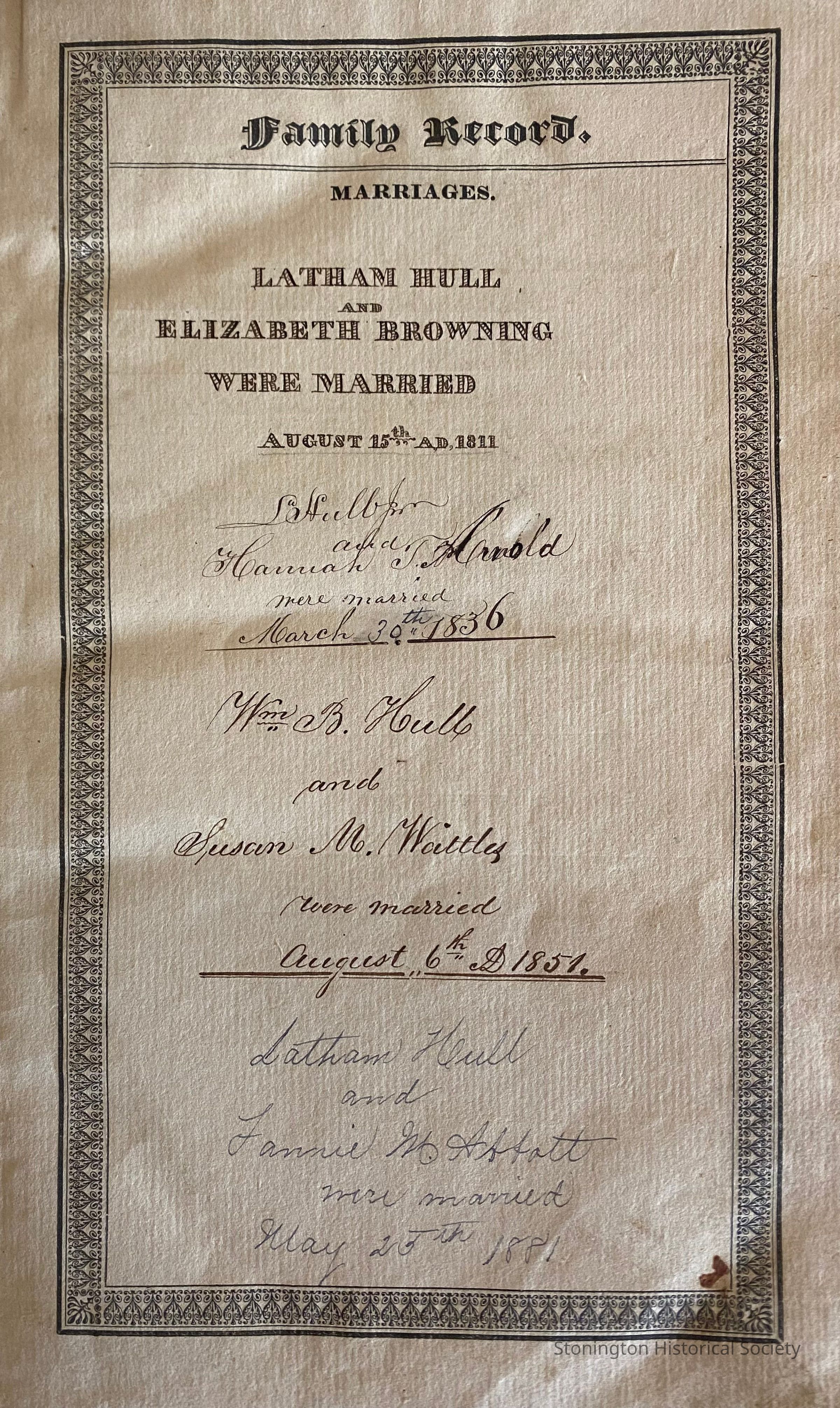 Hull Family Bible with records of births, marriages and deaths for members of the Hull, Minor, Wattles, Abbott and Arnold families. Names: Susan Minor Wattles Hull, Latham Hull, Elizabeth Browning Hull, Latham Hull Jr., Hannah Arnold Hull, William B. Hull, Susan Wattles Hull, Fannie Abbott Hull, Thomas Hull, Annie Hull, Lucy Hull, Charles Hull, Edgar Hull, Edwin Hull, Desire Hull, William T. Browning. Published 1830, family records span 1811-1921.Book Details