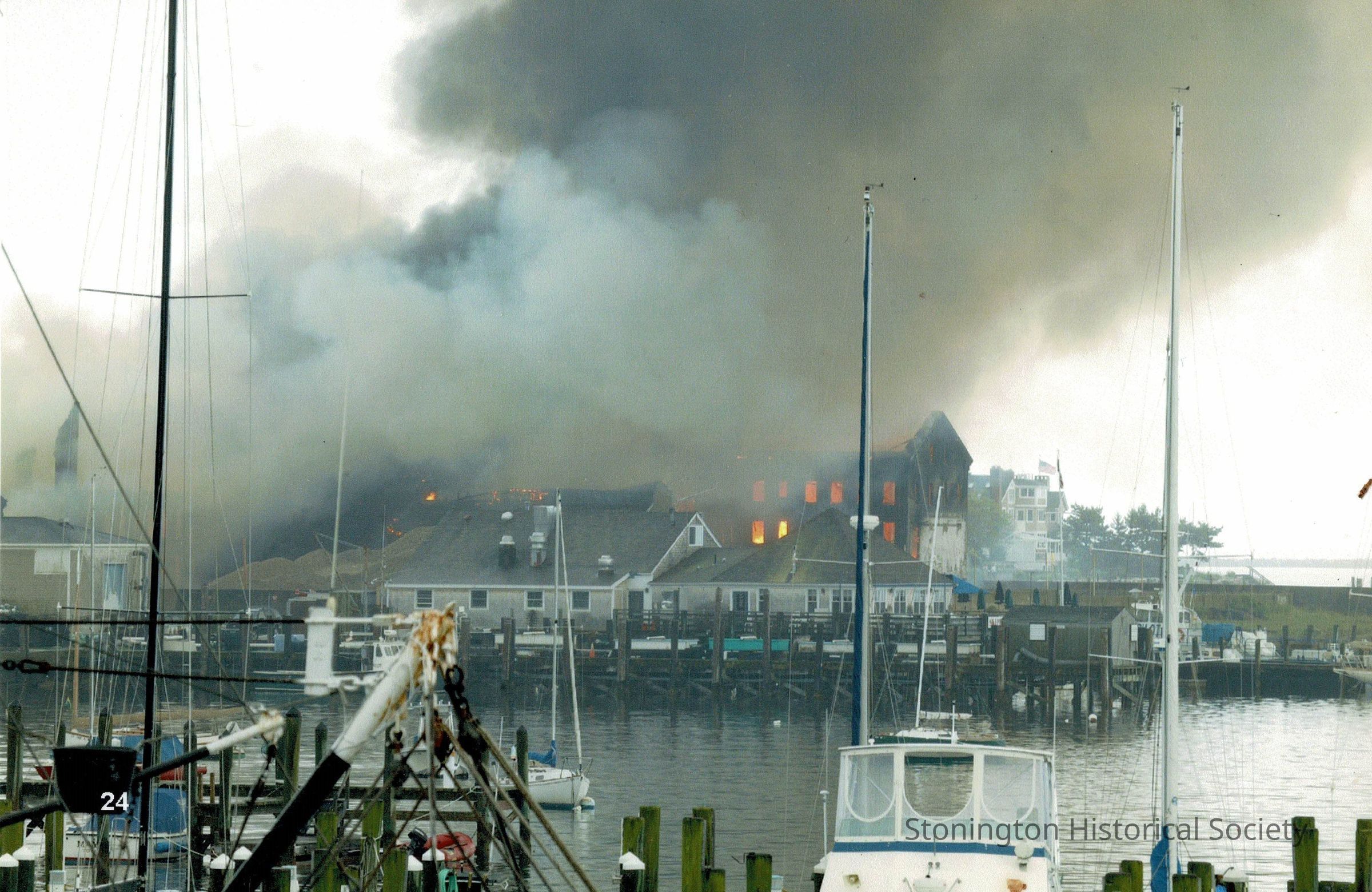 Photograph taken during the fire at the Atwood/Monsanto factory on July 3, 2003. Contractors were working to renovate the factory into luxury condominiums - Stonington Commons. It appears this photograph was taken from the Town Dock, and shows the fire in progress. Stonington Breakwater restaurant is visible in front of the fire.Collection