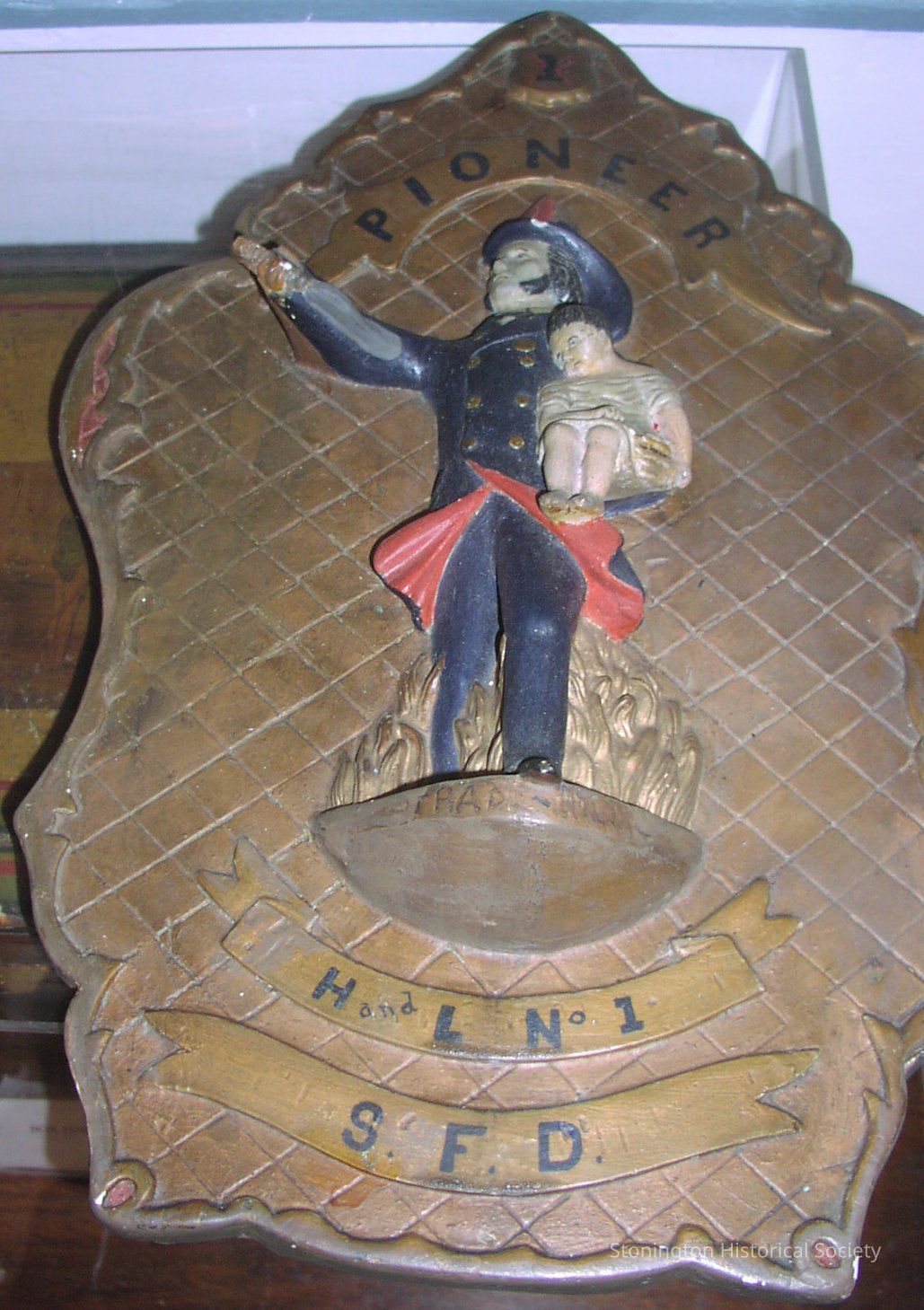 plaque, emblem of Stonington Fire Dept., "Pioneer Hook and Ladder No. 1," depicting a fireman holding a child, standing in flames.Collection