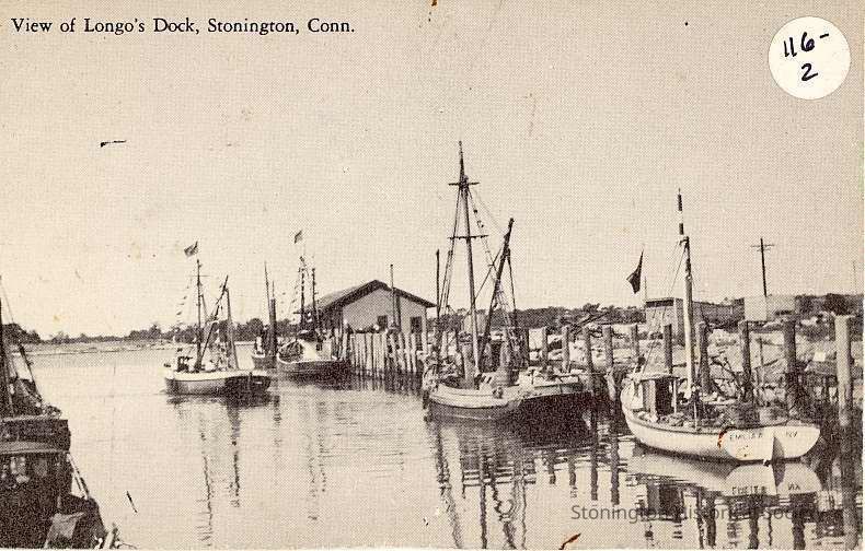 View of Longo's Dock, Stonington CT. On back, Dottie wrote, later view of former Steamboat Dock