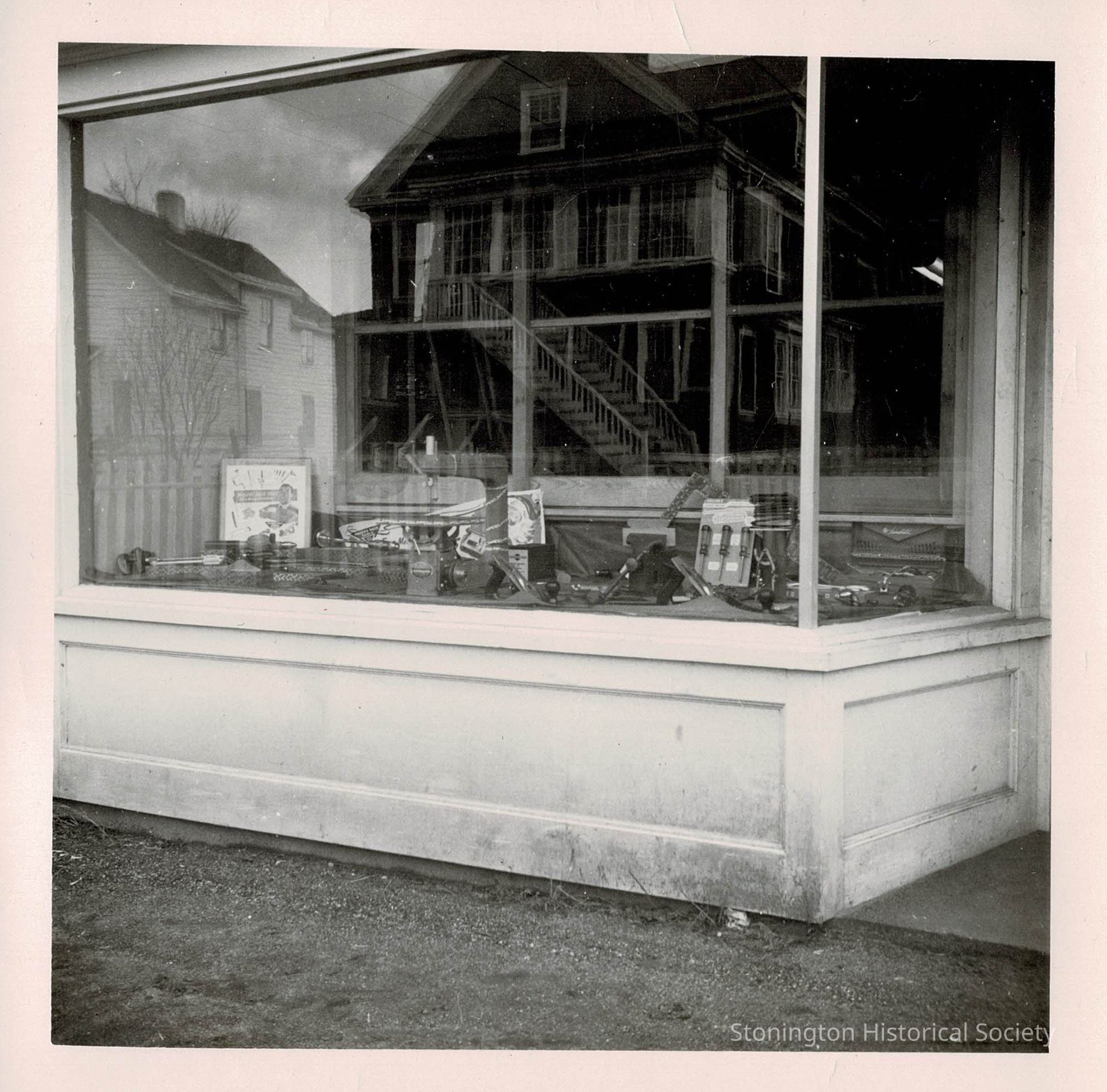 Black and white photograph showing the storefront and display window at Stonington Lumber Company. Photograph is undated but most likely was taken in the 1940s.Collection