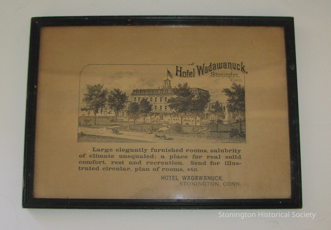 print, Hotel Wadawanuck advertisement, framed. The advertisement reads: "Large elegantly furnished rooms, salubrity of climate unequaled; a place for real solid comfort, rest and recreation. Send for illustrated circular, plan of rooms, etc. Hotel Wadawanuck, Stonington, Conn."Collection
