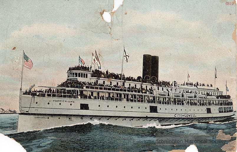 Postcard showing the steamer "City of Lowell" of the Norwich Line. Included are two clippings about the "City of Lowell" and the "Plymoth"