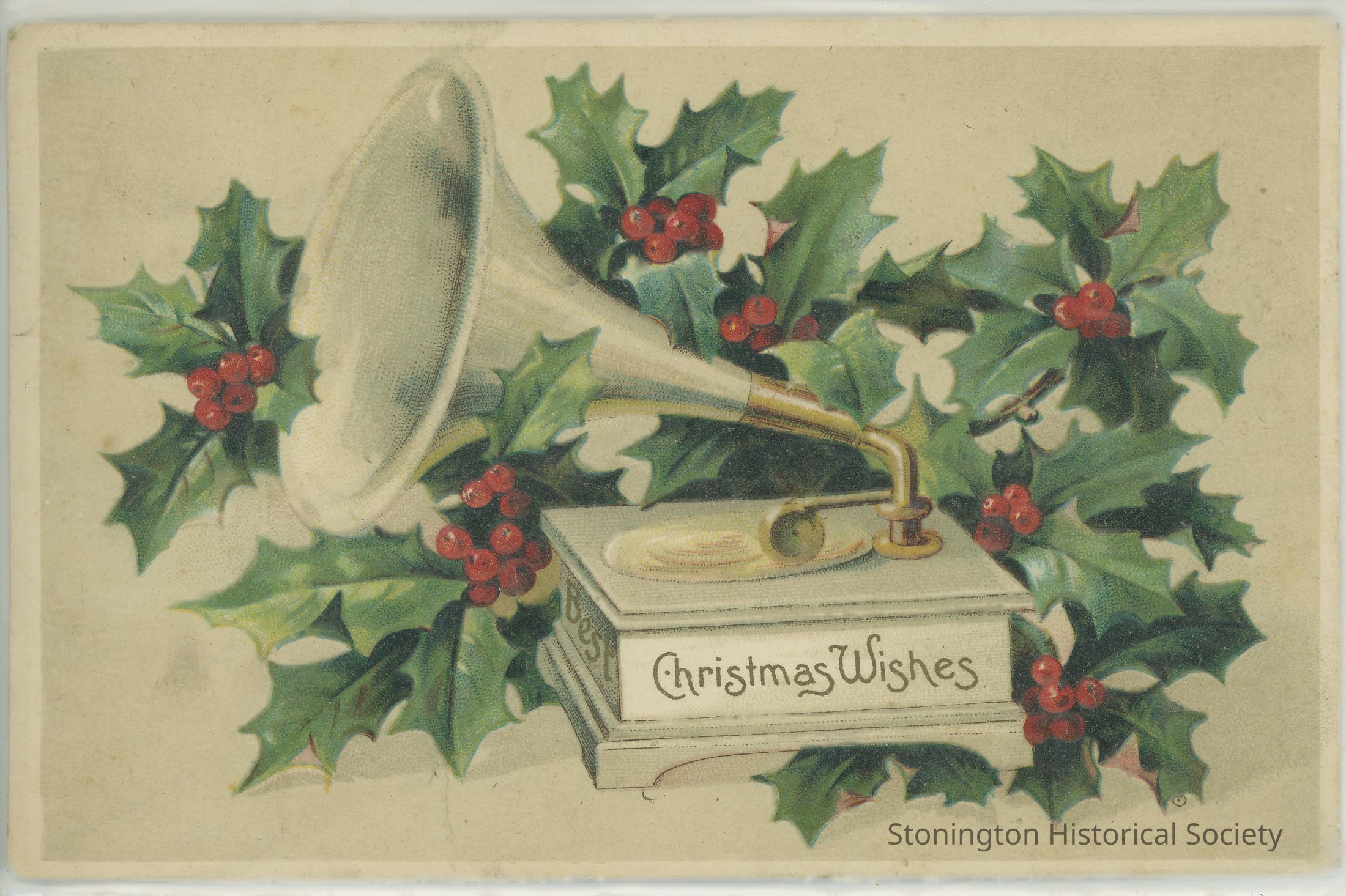 Early record player with trumpet surrounded by holly