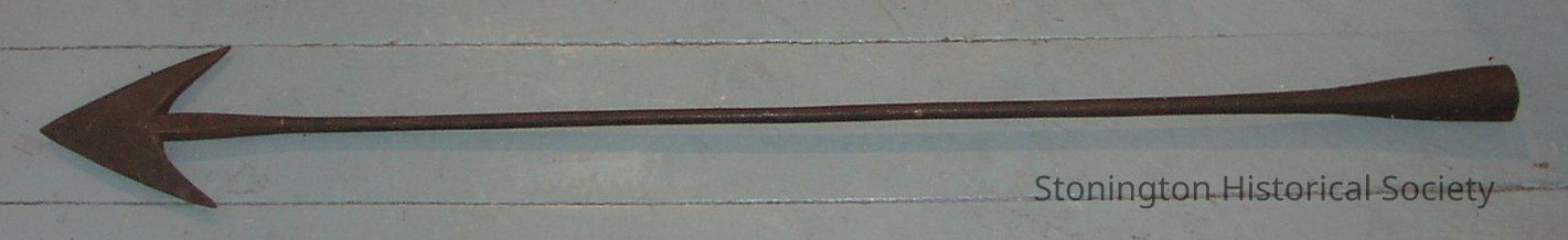iron double barbed harpoon, wooden handle missing. "JM" stamped into shaft near spear point.