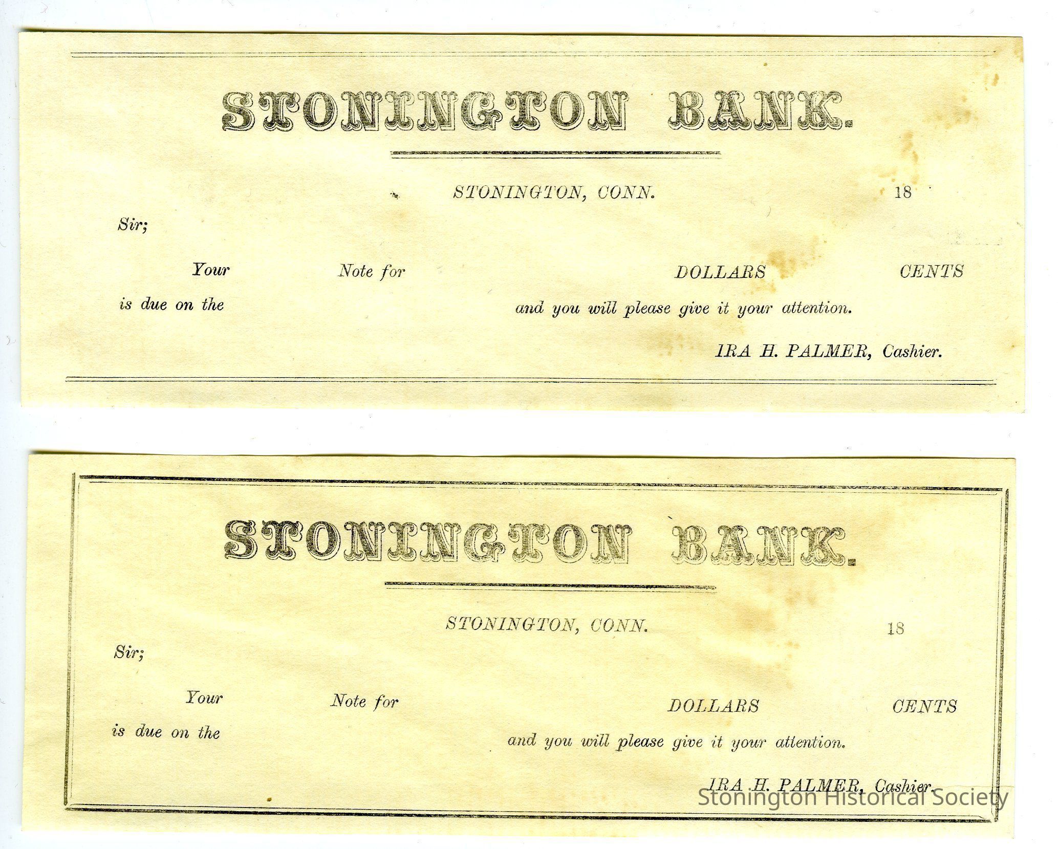 2 blank Stonington Bank payment due notices with Ira H. Palmer, Cashier printed on lower right