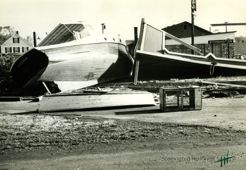 Boats and debris from railroad depot in Stonington