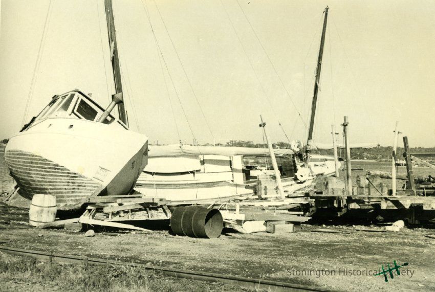 Boats washed on shore at Town Dock with railroad track in foreground