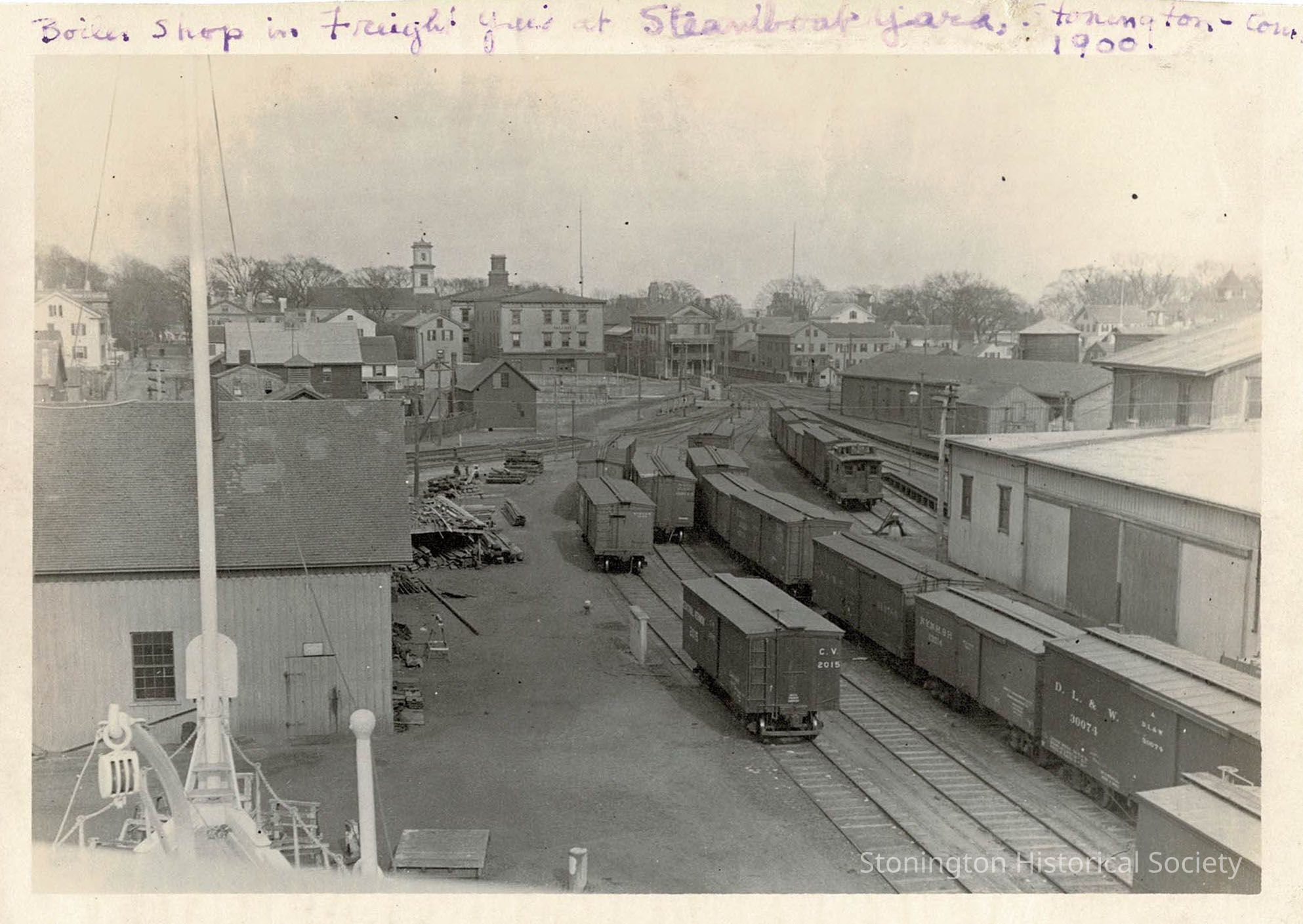Image shows the railroad yard at Stonington. It appears that the photograph was taken from a ship in the yard.Collection