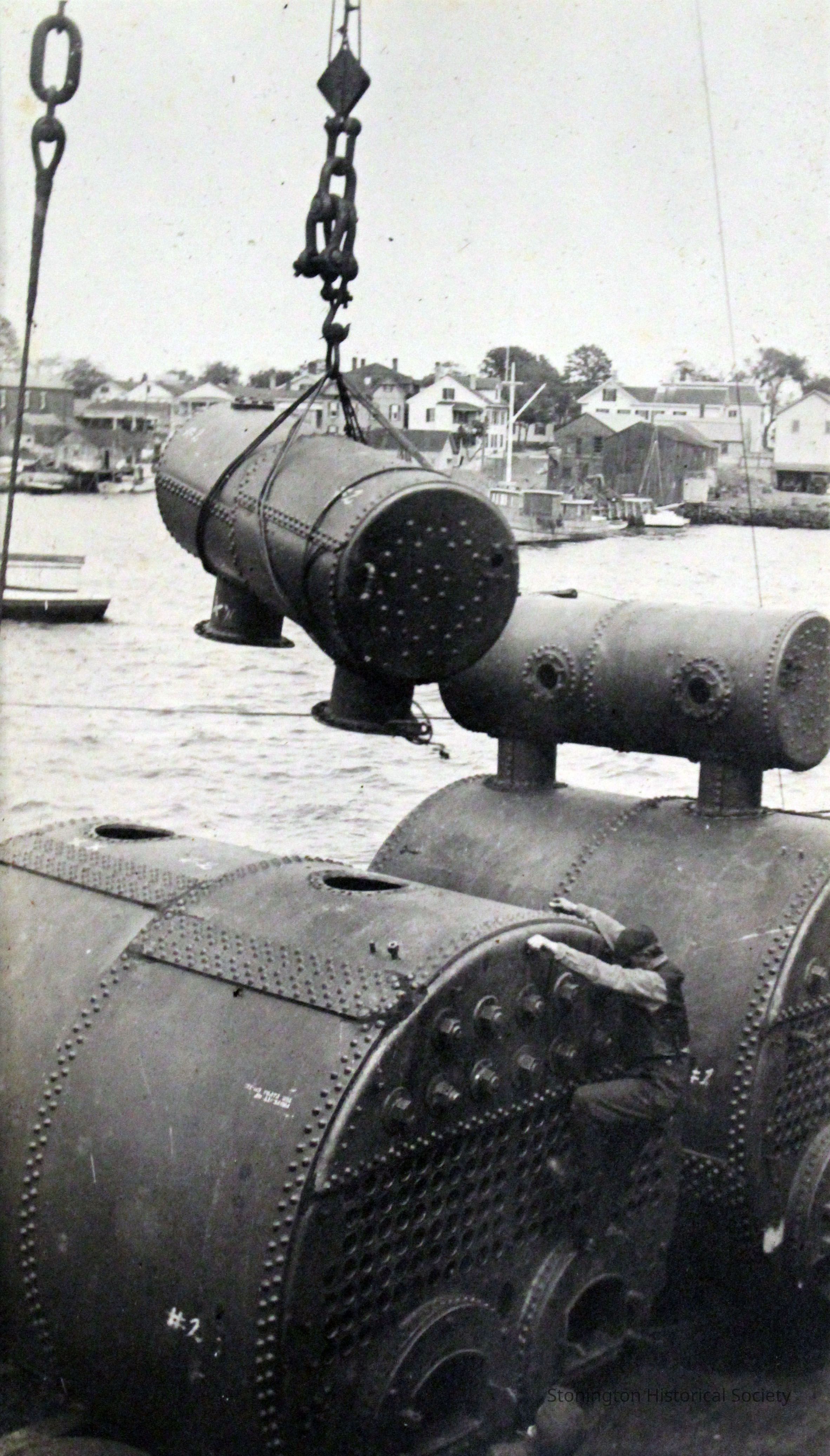 Parts of the steamer boiler being lifted on board the newly rebuilt SS Lansing in early 1919. Refer to worker at bottom right for scale. The Lansing steamship was rebuilt by the Ship Construction and Trading Company, Inc. of Stonington for the Nafra Company of New York.Made/Created