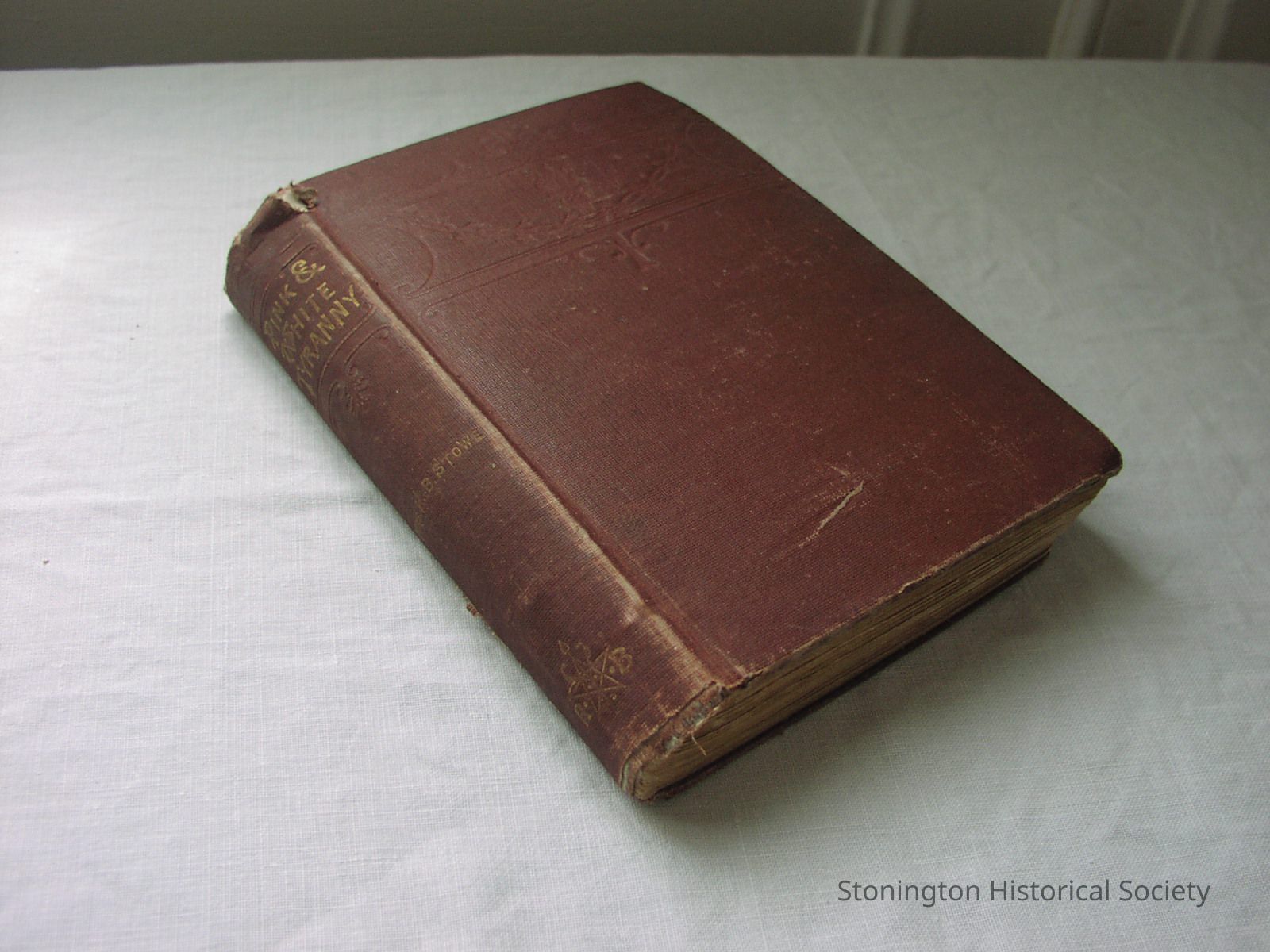 "Pink & White Tyranny" by Harriet Beecher Stowe, pulished by Roberts Brothers, Boston, 1871. Dark red book cover wth gold lettering on the spine.