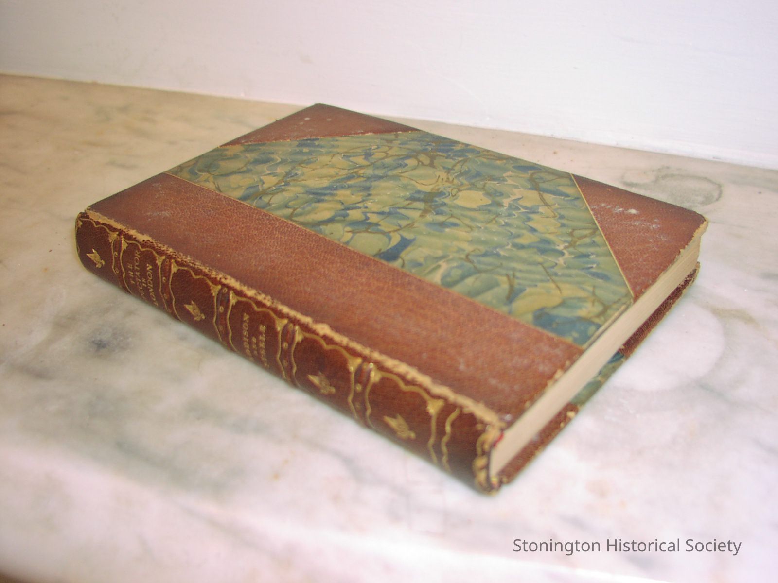 "The Spectator in London" by Addison and Steele, published by Macmillian & Co., New York. Marbled gold, green and blue book cover, reddish brown spine with gold lettering and embellishments.