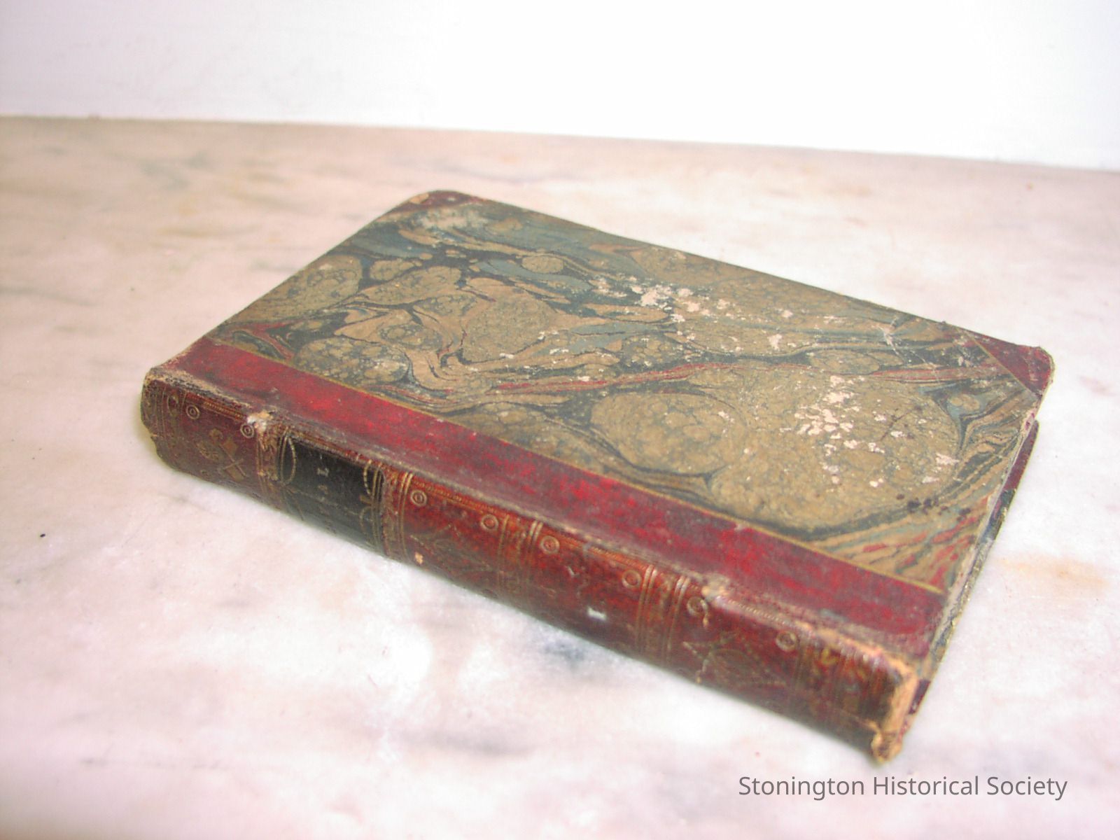 "Chrysal: Or, the Adventures of a Guinea" Volume I pocket edition published by C. Cooke. Blue, red, biege and black marbled book cover, red spine with gold lettering and embellishments.
