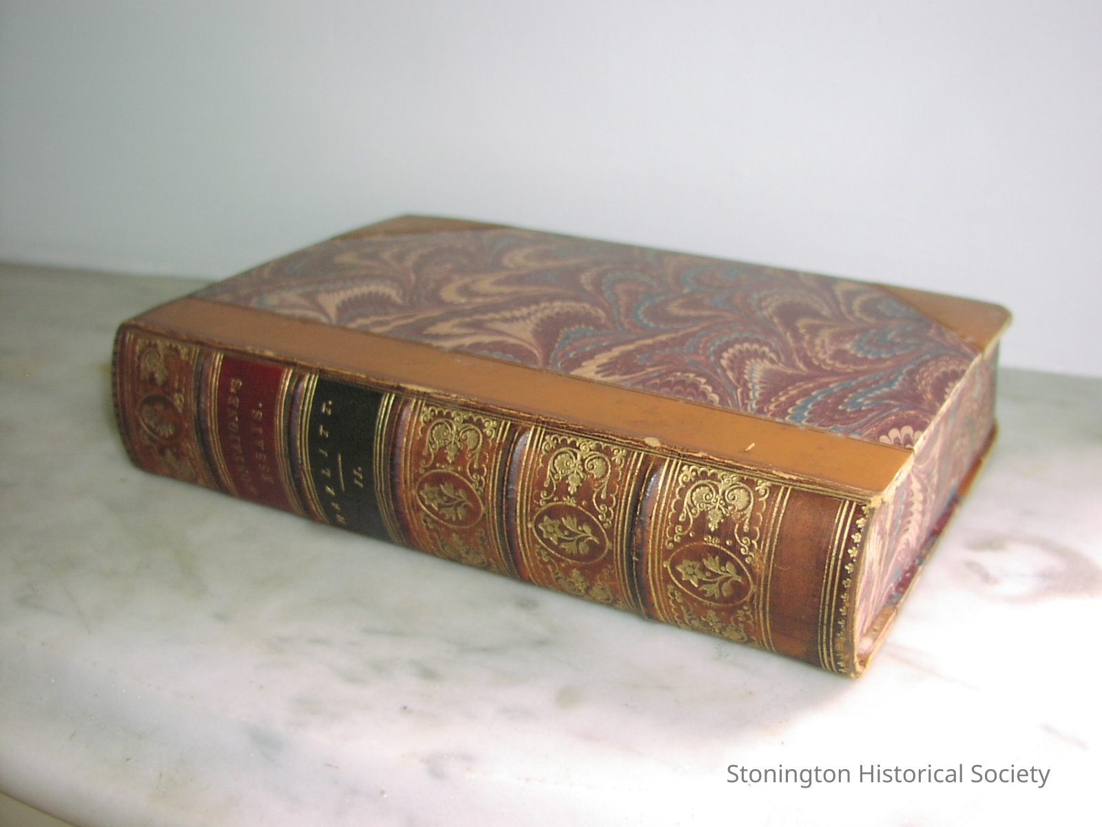 "Montaigne's Essays: Volume II" translated by Charles Cotton, edited by William Carew Hazlitt. Pulished by Reeves and Turner, London, 1877. Blue, red and pink marbled book cover and page edges, brown spine with gold lettering and embellishments.