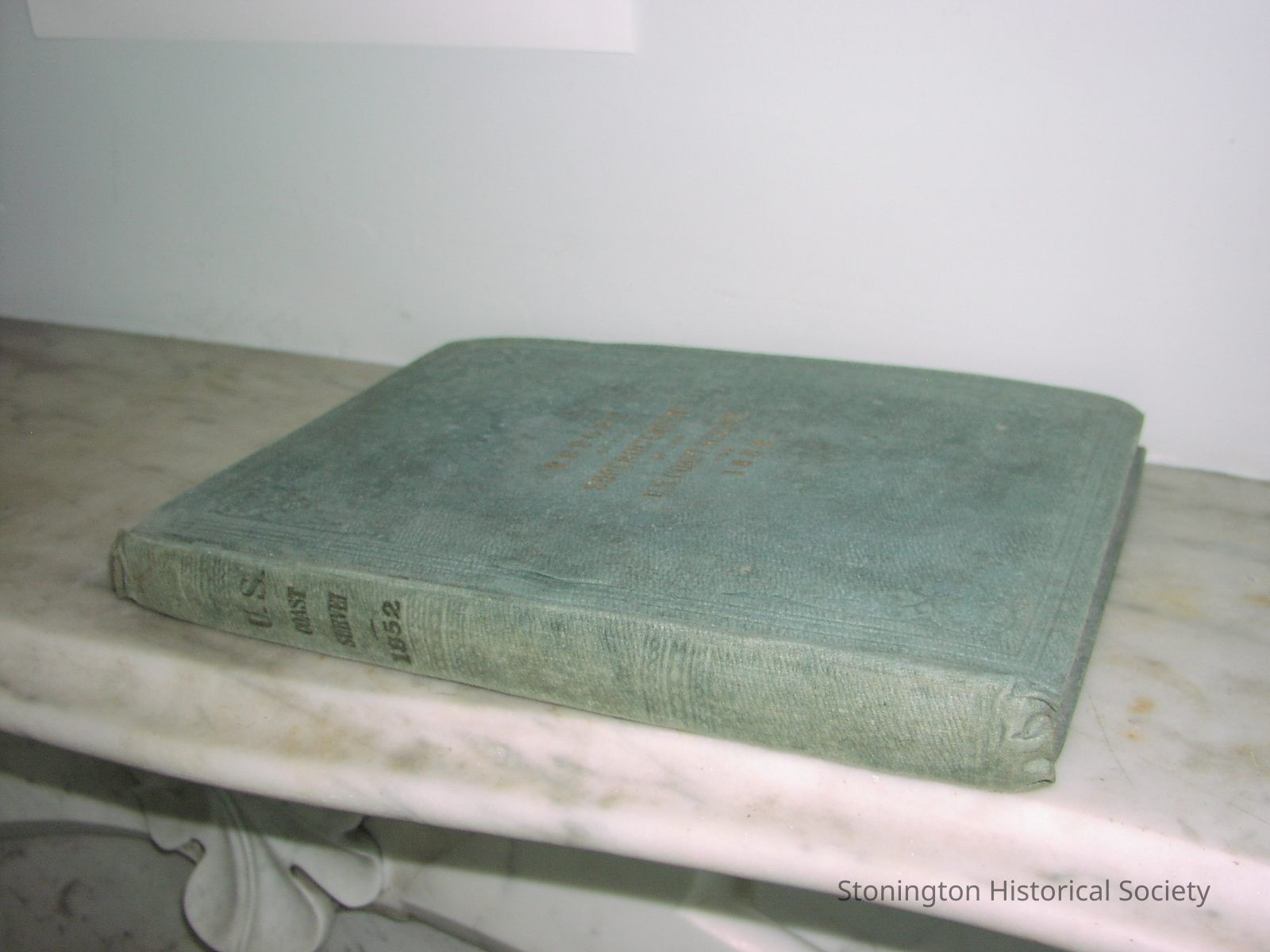 "Report of the Superintendent of the U.S. Coast Survey for 1852" written on cover published by Robert Armstrong, Washington, 1853. Light blue embossed book cover with gold lettering and an embossed design, spine with dark blue lettering.