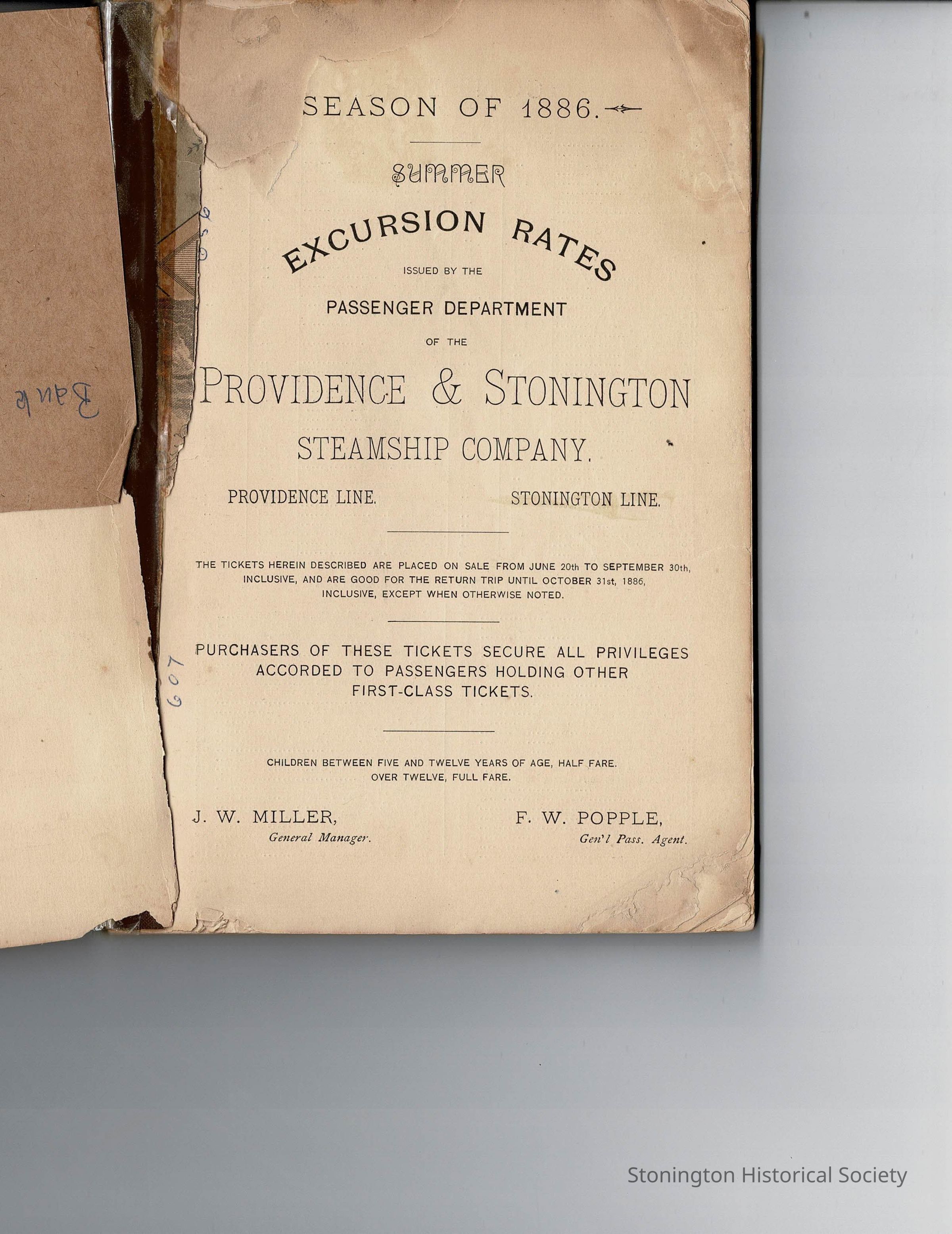 Two booklets produced by the Providence and Stonington Steamship Company. The first is a Summer 1886 catalog of excursion rates for the season. There are descriptions of the destinations, as well as advertisements from the New England area. This book is very fragile and appears to have been repaired in the past with plastic tape. The second booklet is "The Past and Present of Steam Navigation on Long Island Sound" by Henry Whittemore. This was written contemporaneously with the Columbian Exposition in Chicago (World's Fair) and details the beginning of steam navigation, through the present, with many photographs and drawings of the luxury liners of the time period. Tucked into the front cover of this booklet is a time table card from 1887 for the Stonington and Watch Hill Ferry.Collection