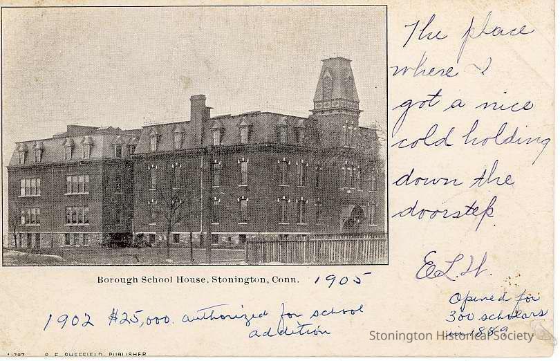 Borough School House from the north, Stonington, with notes sent to Miss Nettie Spencer of Hope Valley RI in 1905