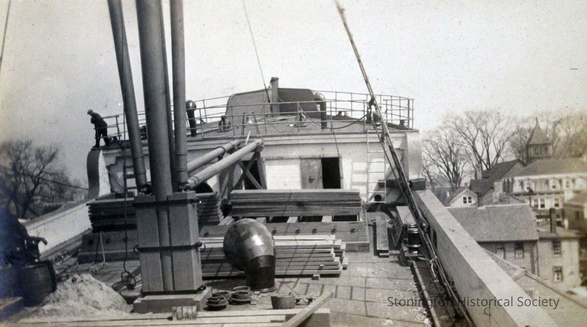 Hatch on the deck of the SS Lansing near the bow. This would have been near the end of the construction process, in the spring of 1919. A few rooftops of buildings in Stonington Borough are visible in the right background. Materials and tools are visible in the foreground. One worker can be seen on the left upper deck. The Lansing steamship was rebuilt by the Ship Construction and Trading Company, Inc. of Stonington for the Nafra Company of New York.Made/Created