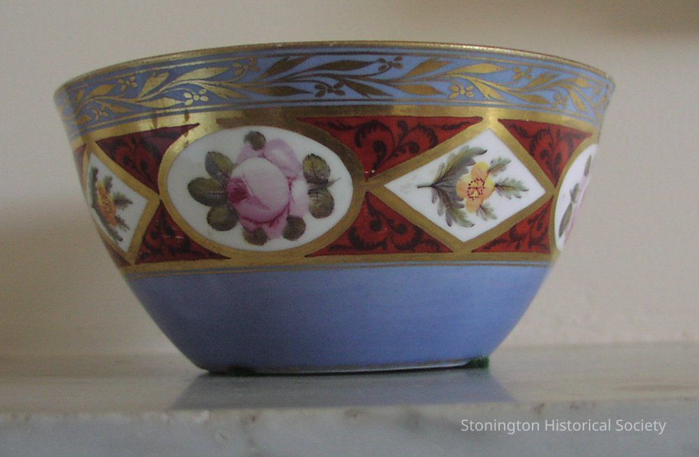 Porcelain bowl; blue; red band with shite & flowered lozenges & ovals; gold decorations; white inside; bottom shows design of crossed lines with M & 875 engraved at wider end fo lines.Collection