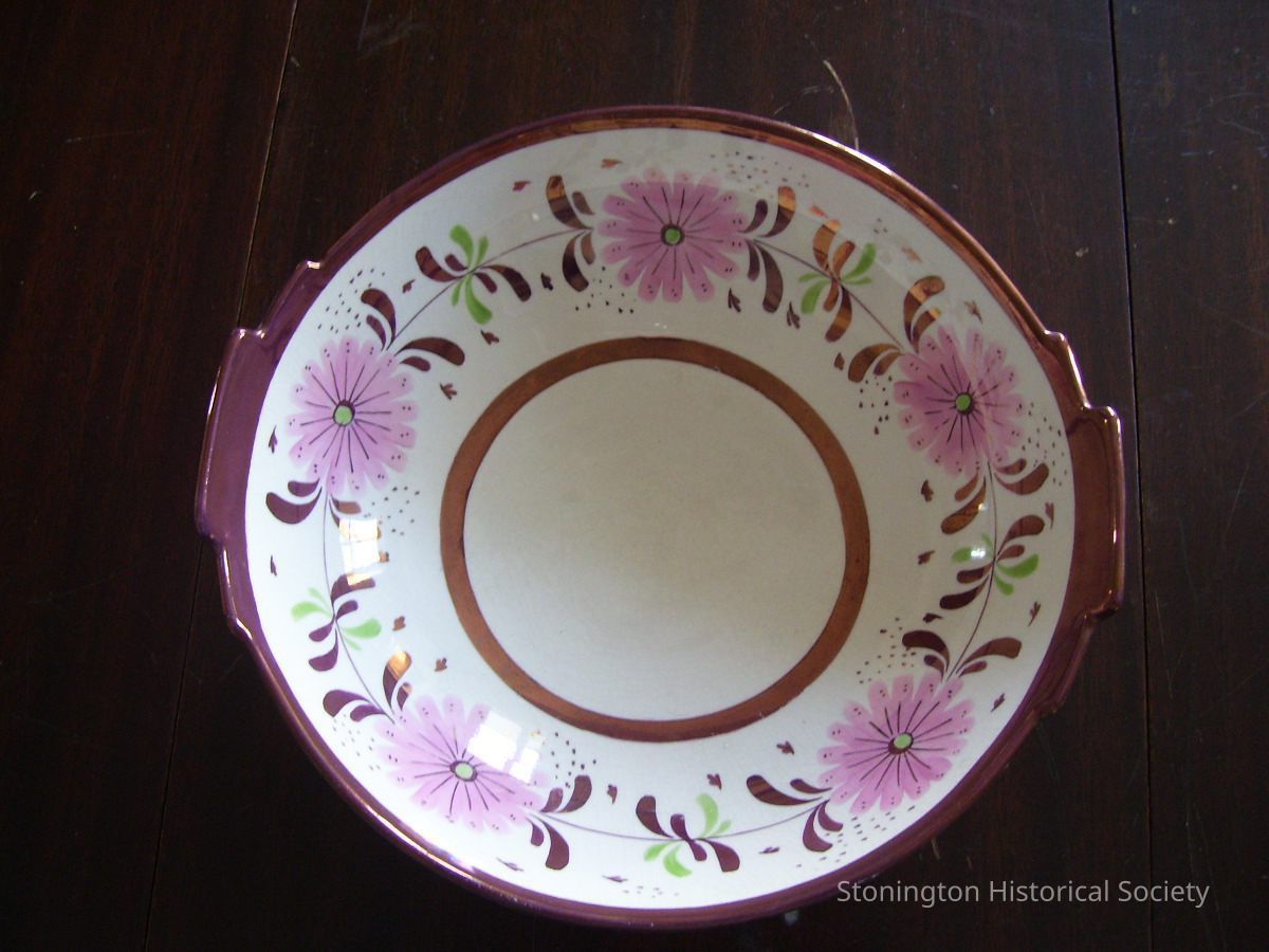 Large bowl has pink luster edging at the top with a circle of pink at the bottom of the bowl. The inner edging of the bowl features large pink flowers with pink luster leaves. The outisde of the bowl has a pink luster vine with green polka dots on either side. The bottom is marked "Old Castle Made in England."Collection