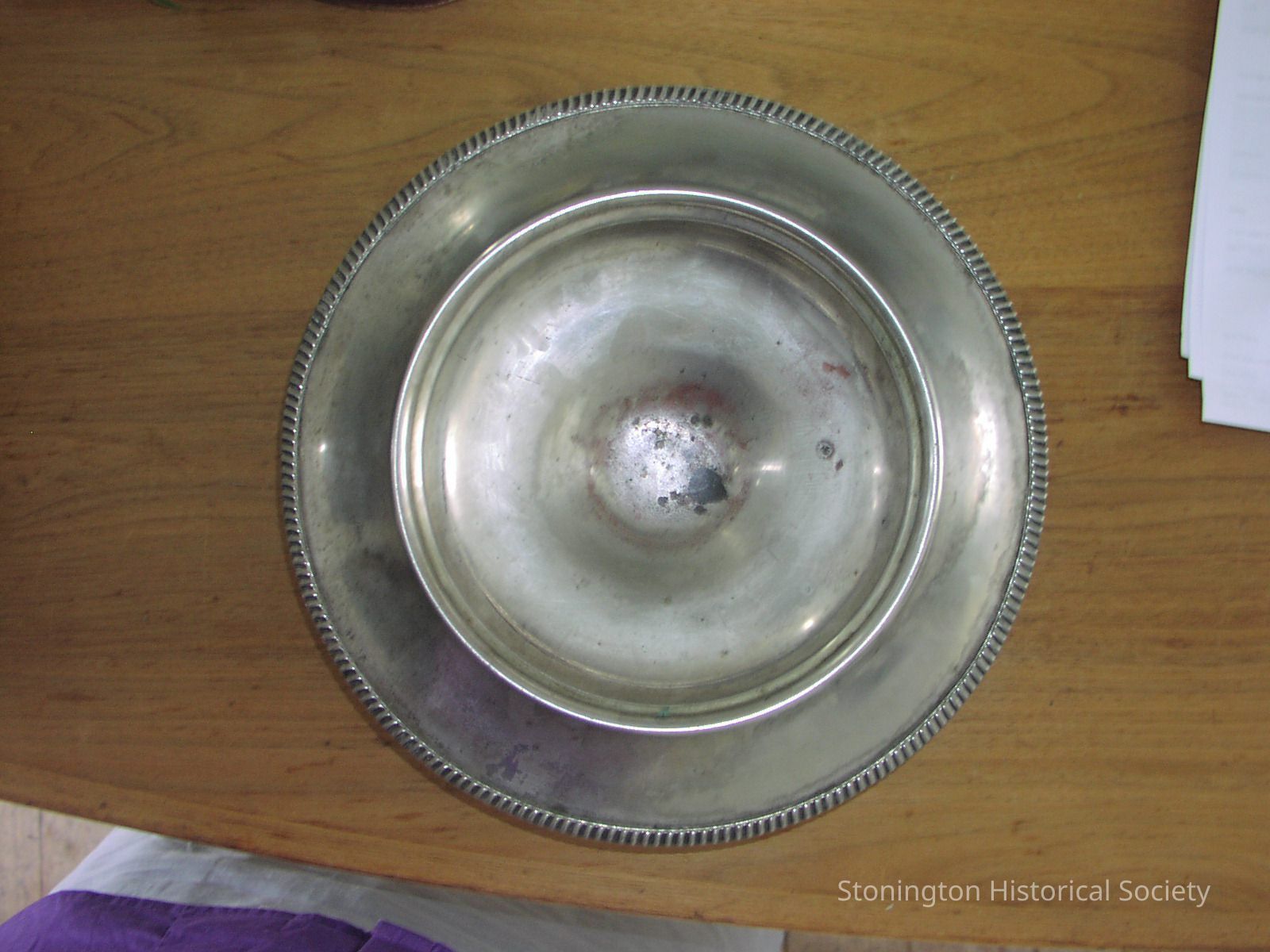 Silver plated decorative bowl, round, with pie crust edge. Copper showing through at bottom of bowl. Marked "Sheets Rockford S 00 1875 1603."Collection