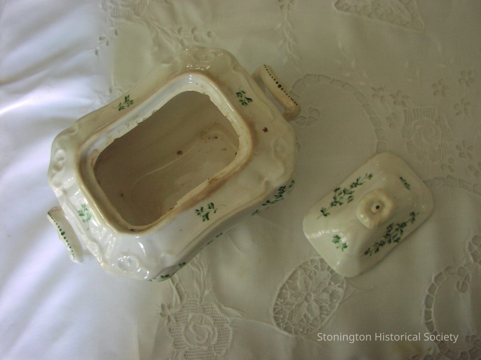 Sugar bowl Part of eleven piece set; white with green sprigs, called "spriggled" by Betsey Denison, original owner.