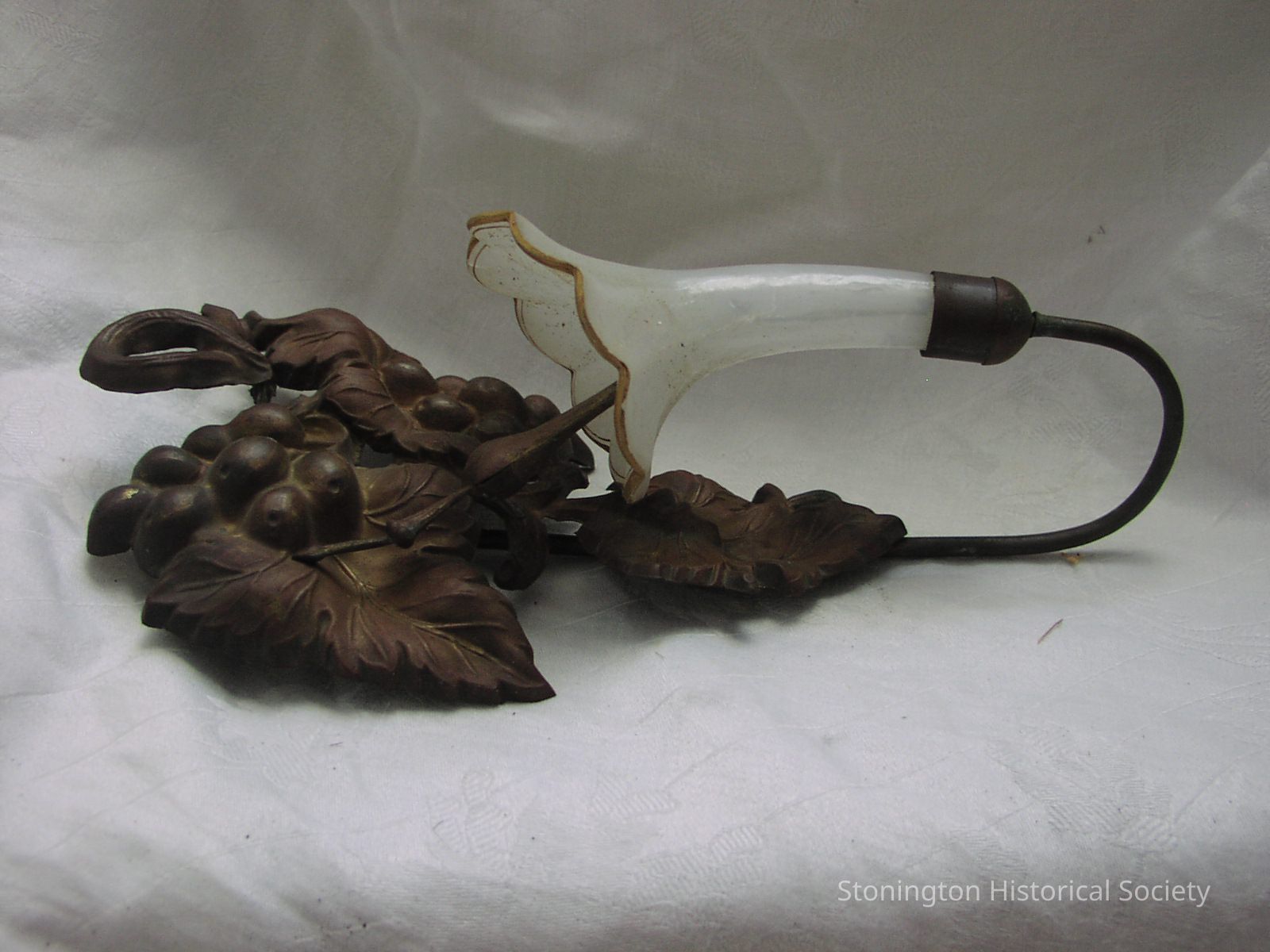 Six metal pieces to curtain tie-backs and one glass flower. Flowers and leaves with berries in cast metal decorate the tie-backs.Collection