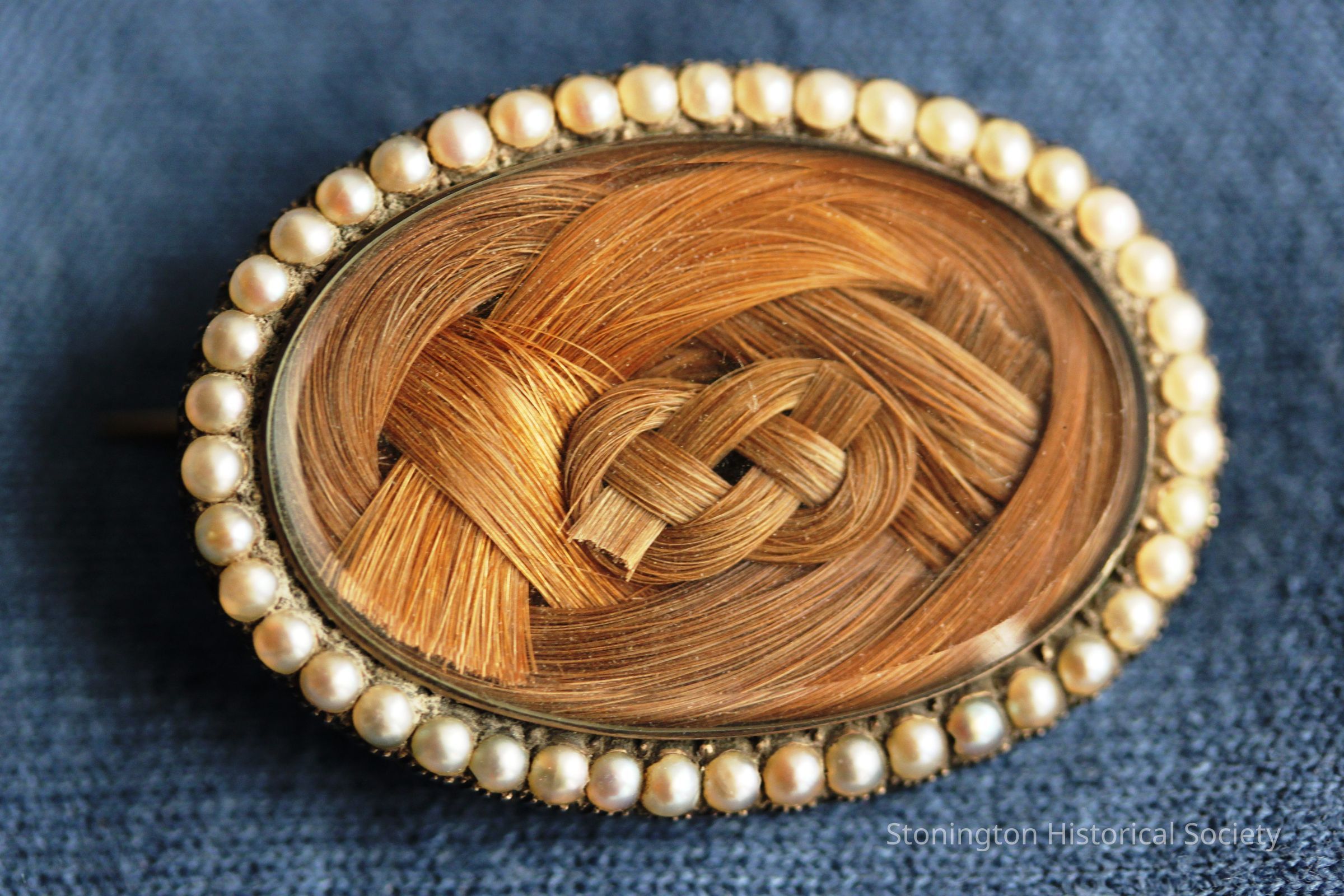 Oval shaped hair brooch surrounded with seed pearls and backed in gold washed frame. Hair set under beveled glass. Brown hair arranged into a woven pattern. Hair of Juliet Palmer Fanning and her daughter Sarah: given to Grace Noyes Stanton, 1844.