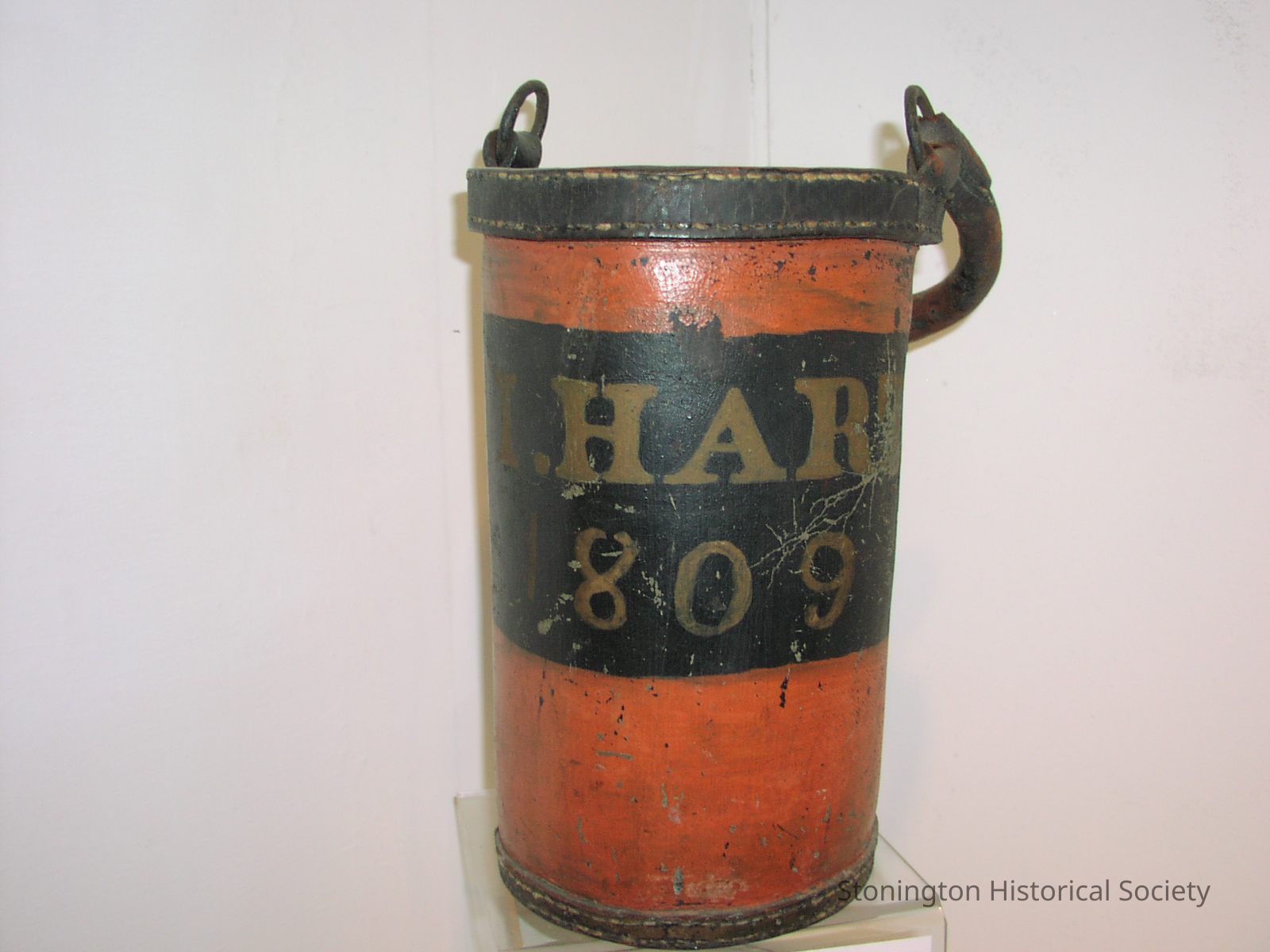 Cylindrial shaped red-orange fire bucket reads "I. Hart 1809" against a black background.