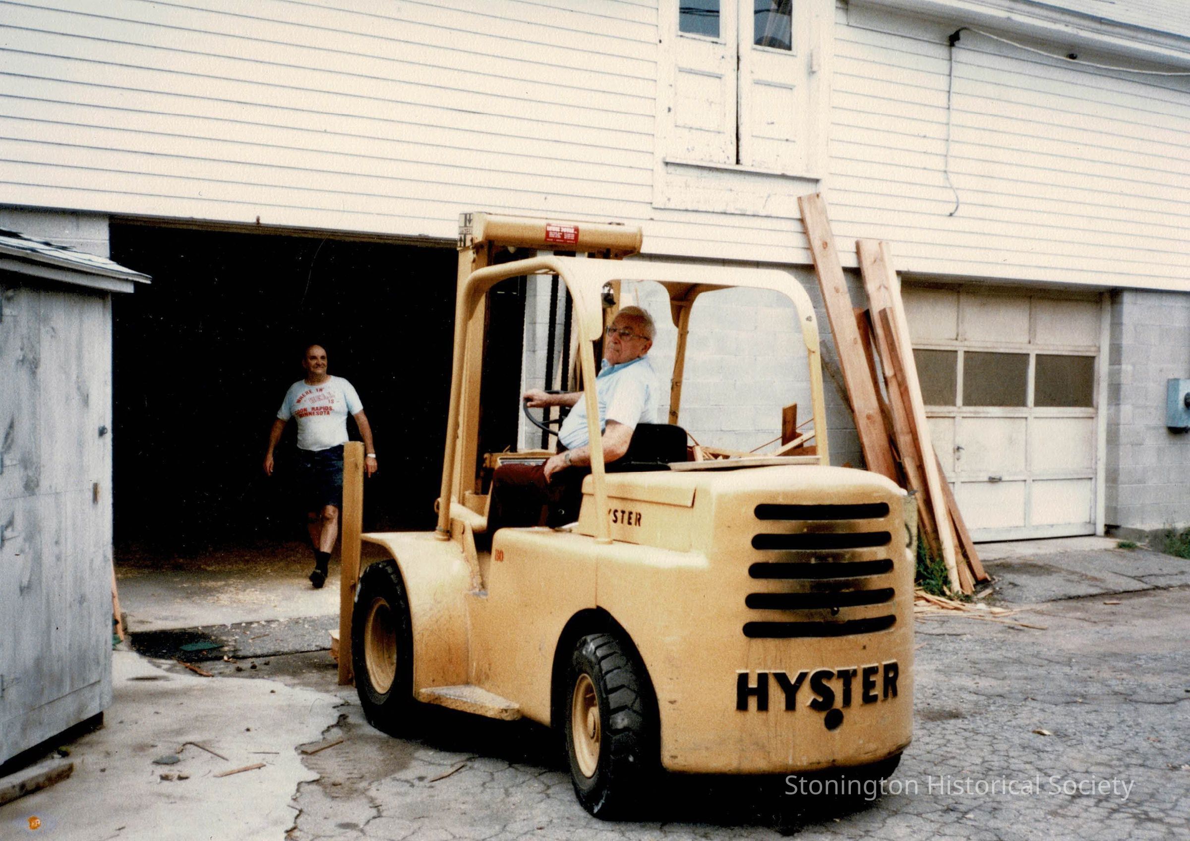 Color photograph of Burrows Perry (1897-1990) sitting in the forklift, and his son, Andy Perry (1927-2014) at Stonington Lumber Company, on Main Street in Stonington Borough. Burrows had started the business in 1929 with his father, Andrew Wheaton Perry (1867-1948).Collection