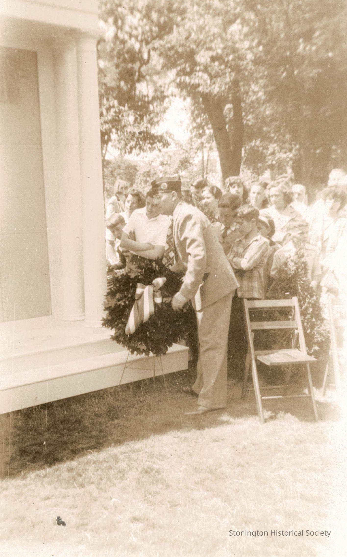 Photograph of Burrows Perry (1897-1990) placing flowers on the Stonington Honor Roll in front of the Stonington Free Library, 1944. The honor roll was designed by S. Jerome Hoxie and was built by Burrows Perry. It was unveiled by Mrs. Emily T. Wood on May 31, 1944.Collection