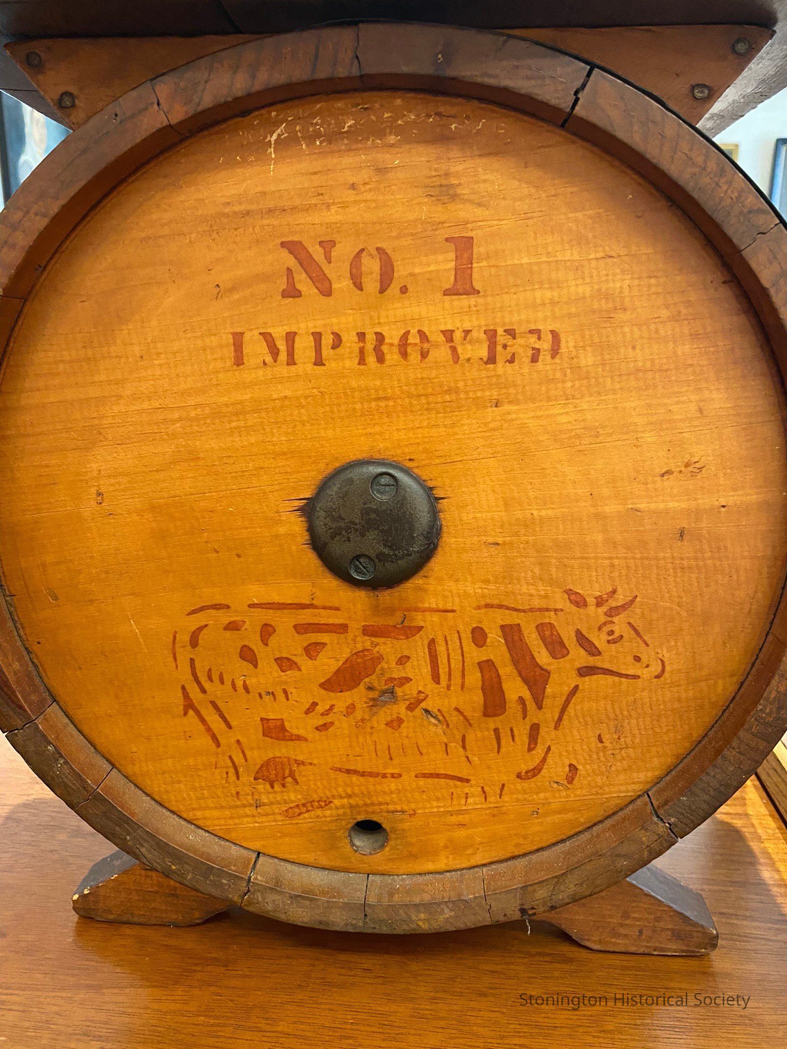 Antique Vintage Bronson Townsend New Haven CT No. 1 Improved Crank Butter Churn that was made by the Bronson & Townsend Company of New Haven, Connecticut. One side has the company name in stencil paint lettering and the other has the model and a cow graphic. Turns smoothly. Crank handle in good condition. Came out of the former Birchwood Dairy on South Broad Street in Pawcatuck.Collection