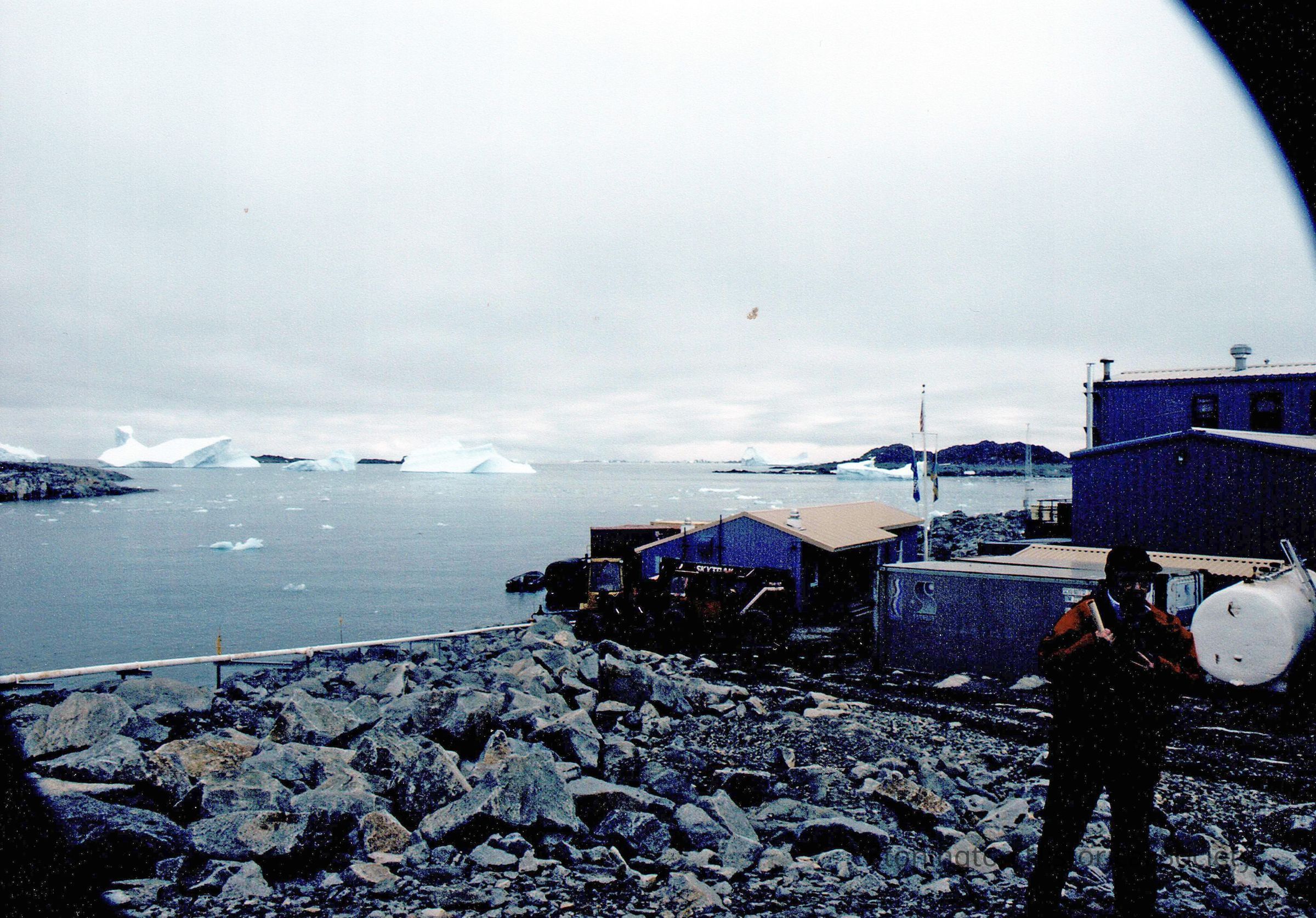 Photograph taken by Richard J. Scheffler on Anvers Island, Antarctica (Palmer Station) in February of 2003. Mr. Scheffler was on a Lindblad Expeditions trip on the vessel Endeavour. Photographs were taken with a Minolta Dimage 7Hi digital camera. This photograph depicts a view towards the storage buildings as seen from the island's oil tank. Glaciers and icebergs can be seen in the background.Collection