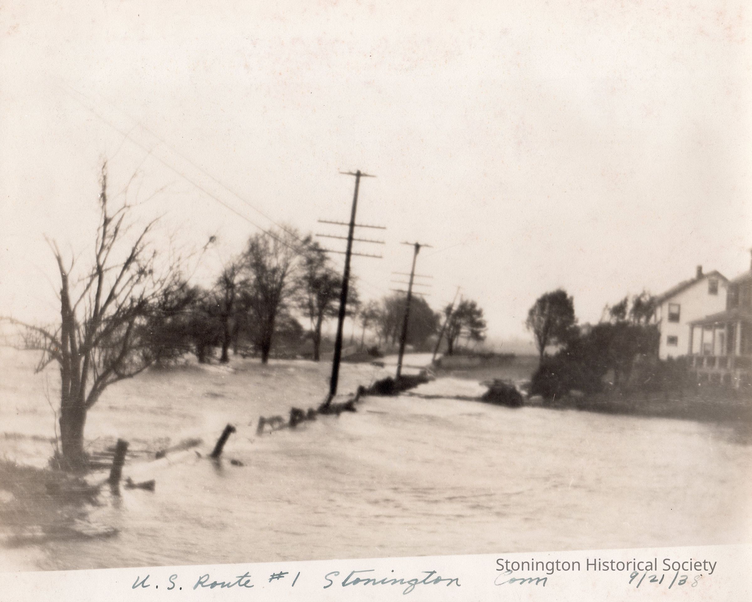 Sepia photograph with black and white copy print, view of hurricane damage along U.S. Route 1 at Sheridan's Corner, 1938. Given to the Society by Harry Northup before his death. With note: "A view at Sheridan's Corner, looking to the West. The Vargas Brothers' homes are to the right in the picture. The bright surface in the center is Highway U.S. # 1, going to Mystic, Connecticut and beyond. The dark land mass to the left of the road is the Catholic Church Cemetery. Note how high the flood waters came up on the Eastern end (nearest you). It was a terrible day."Collection
