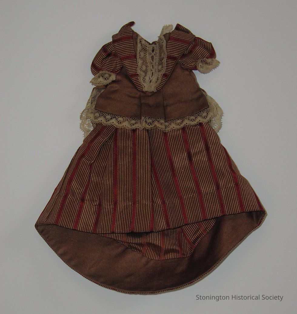 doll's dress, 2 piece red and beige striped taffeta with lace trim