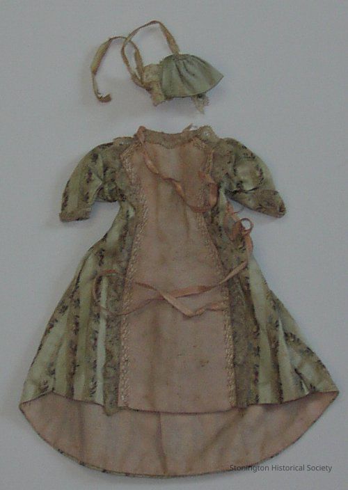 doll's dress, pale pink and flowered ball gown with center panel and a pale green bonnet