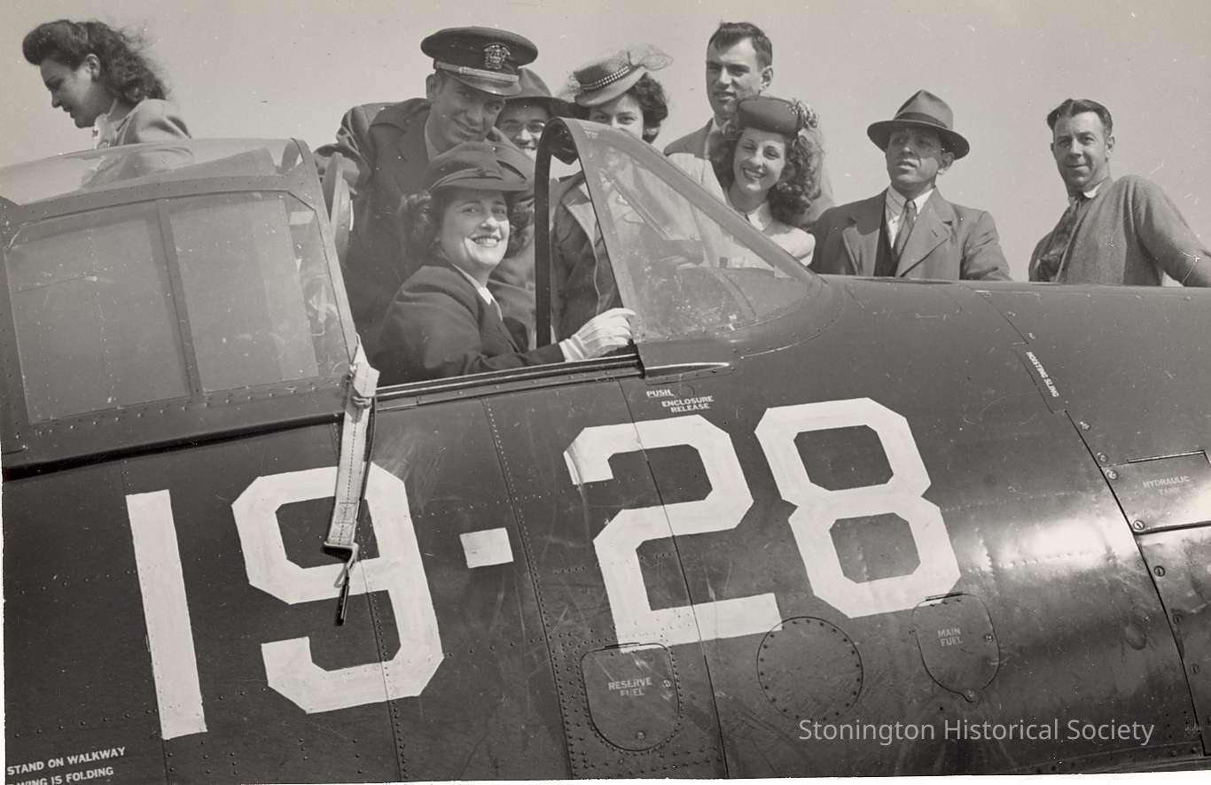 U. S. Naval Auxiliary Air Facility, Westerly RI. Photo of Dorothea Gould (sitting in cockpit) and other bond sellers on tour, April 20, 1945