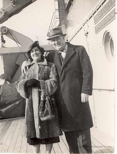 Dorothea & Fred Gould geting ready to debark in New York (Pier 10) from "Barrett" 11/14/1952 coming back on leave from Southampton Eng. Notes on back of photo.