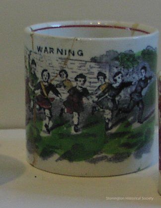 miniature mug, "Warning," decal of a group of running children "Powel" written on bottom of mug