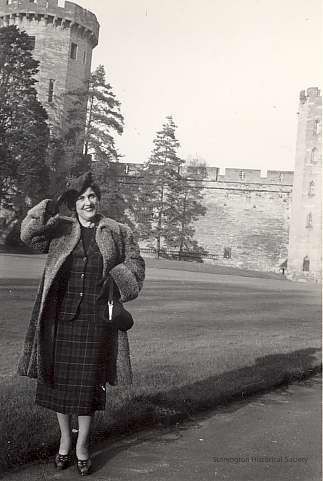 Dorothea in front of Warwick Castle, England. In section marked 1950s