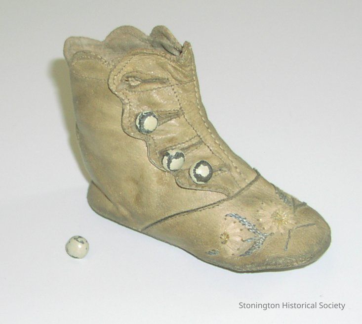 child's right leather shoe, tan kid, embroidered toe, 4 metal side buttons painted white scallop ankle and button edges machine made