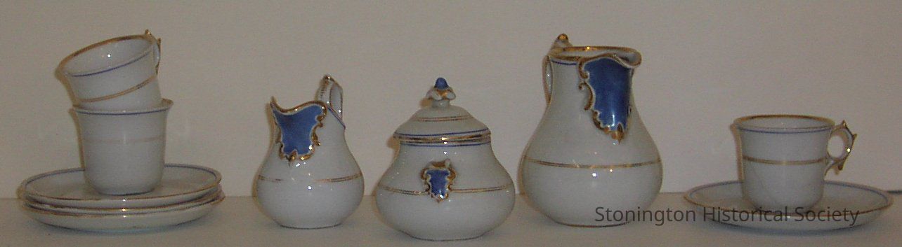 child's tea set, white and blue with gold bands, 10 pieces (3 cups, 4 saucers, 1 sugar bowl with lid, 1 large pitcher and 1 small pitcher)