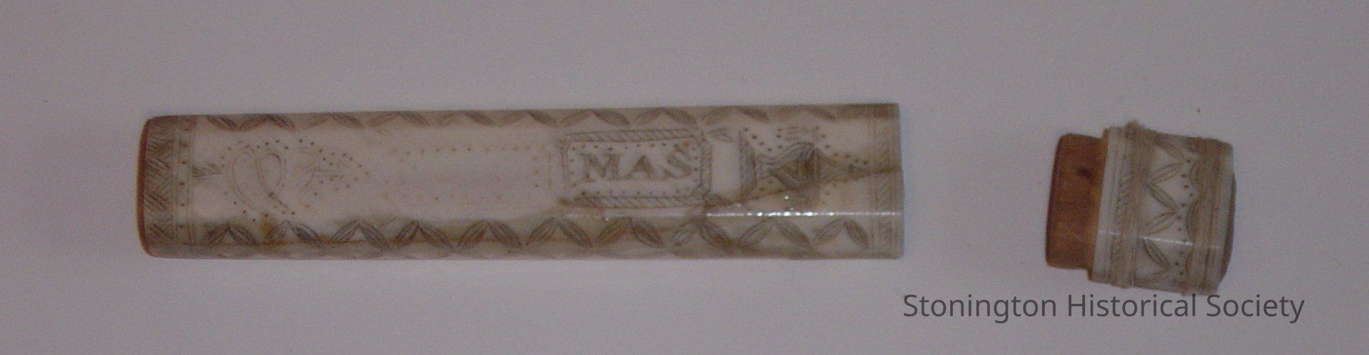 bodkin case done in scrimshaw, engraved on one side is "MAS" with an arrow going through two hearts. On the other side is a planter that has a heart on the pot. Crackes on both sides of case. A chip missing on edgeCollection